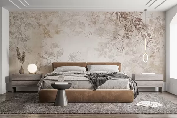 Fototapet Artă florală vintage texturată, cu ilustrații delicate ale florilor și frunzelor din grădină, în stil desen, în tonuri pastelate delicate de bej și sepia Nr. w09402