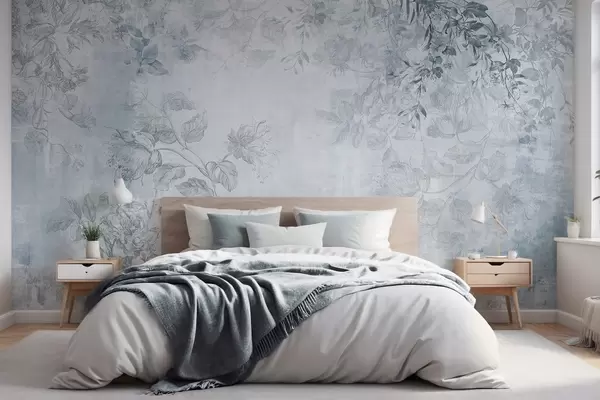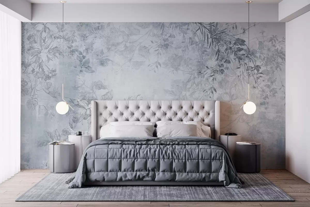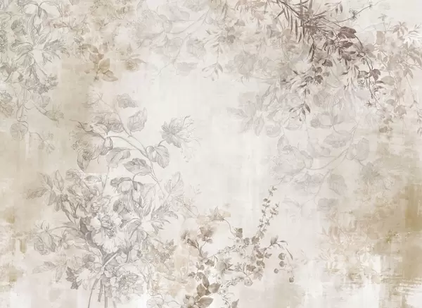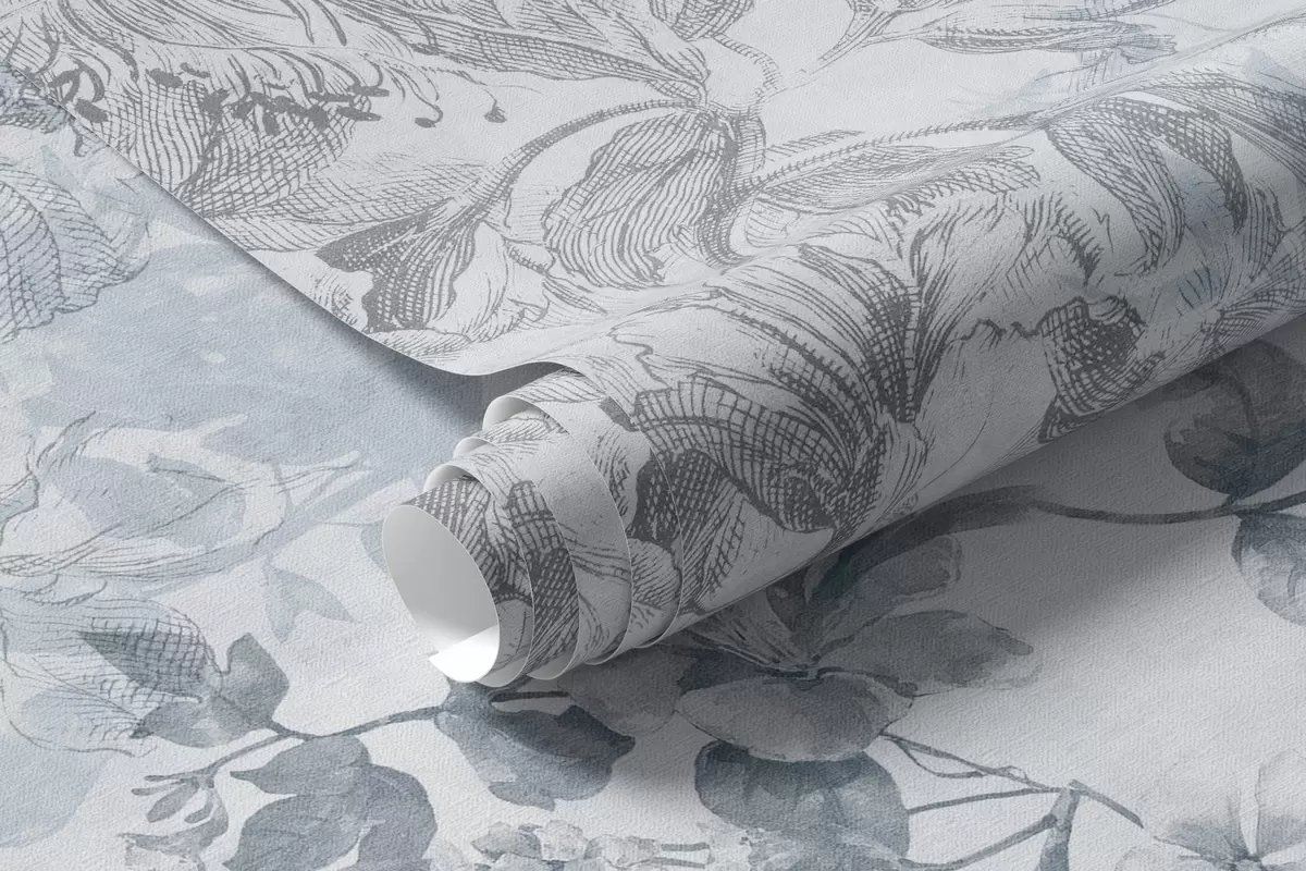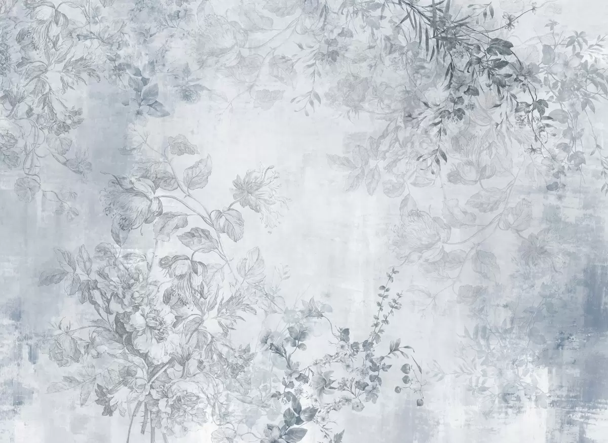 Fototapet Artă florală vintage texturată, cu ilustrații delicate ale florilor și frunzelor din grădină, în stil desen, în nuanțe delicate de albastru Nr. w09402v1