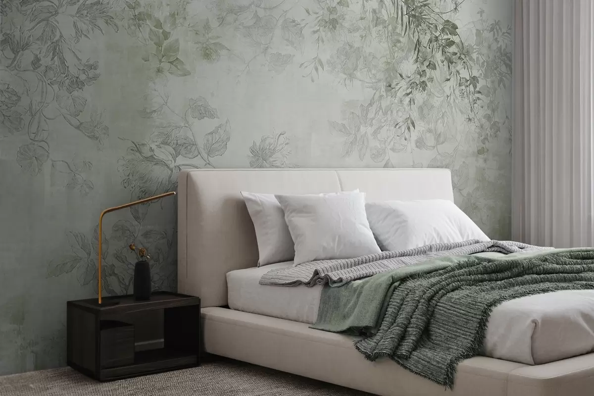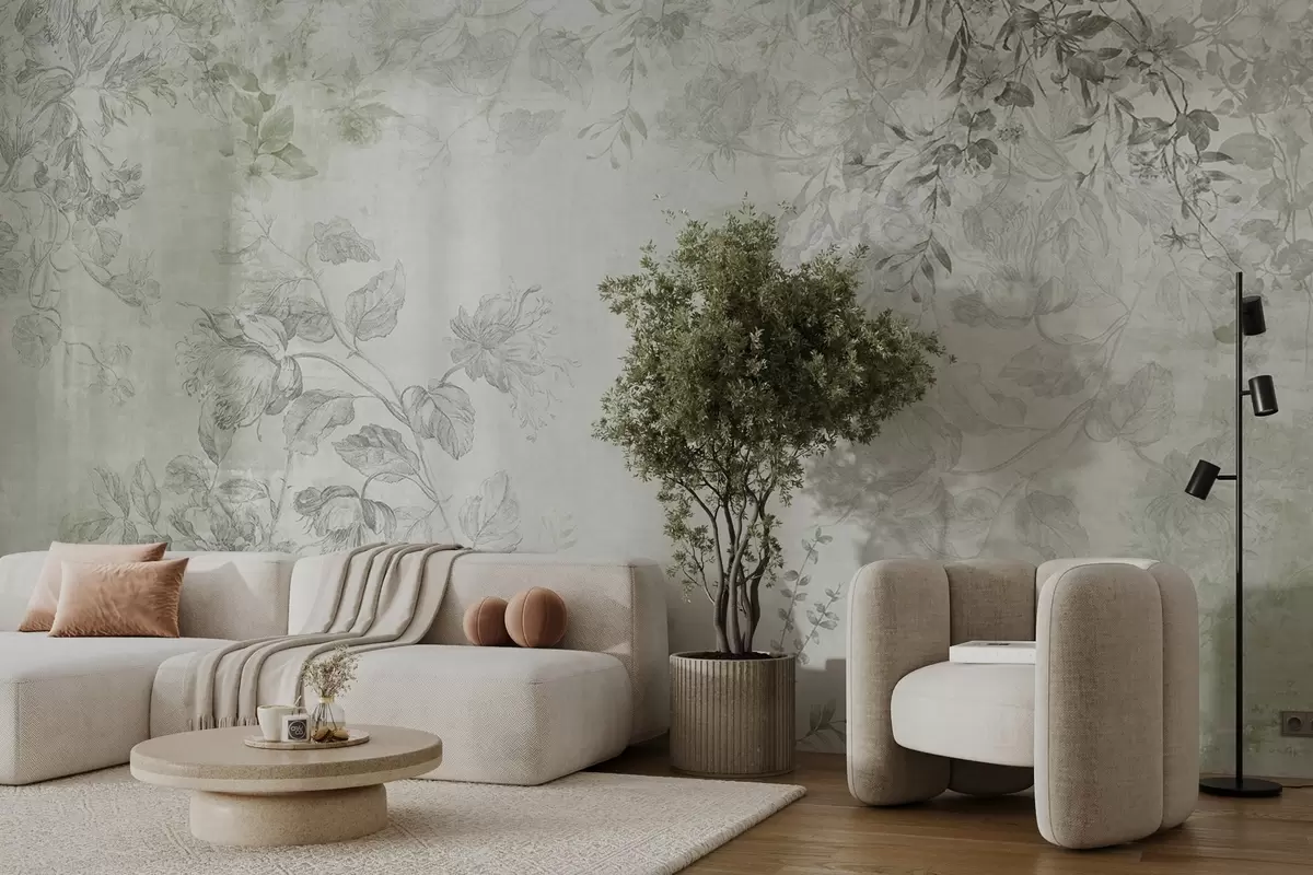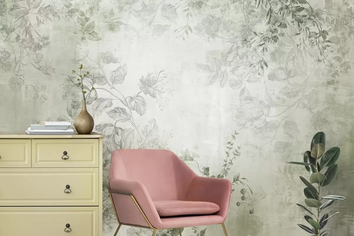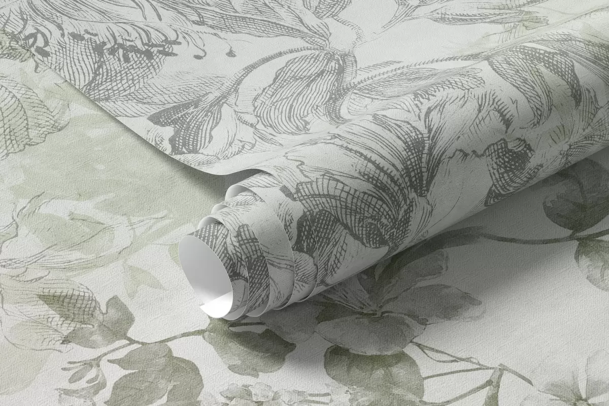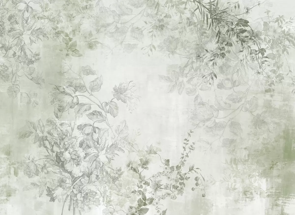 Fototapet Artă florală vintage texturată, cu ilustrații delicate ale florilor și frunzelor din grădină, în stil desen, în tonuri delicate de verde Nr. w09402v2