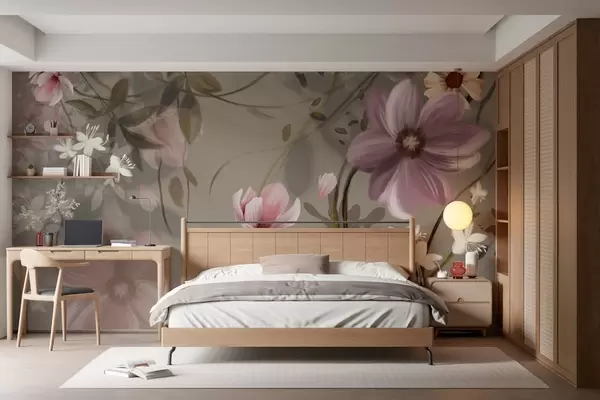 Fototapet Flori roz și albe cu tulpini și frunze maronii, lumină difuză, culori discrete, aranjament floral Nr. w09417