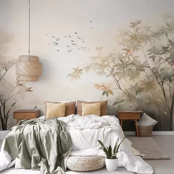 Fototapet Peisaj texturat cu copaci și o turmă de păsări zburând pe cer, culori pastelate, scenă din natură Nr. w09418