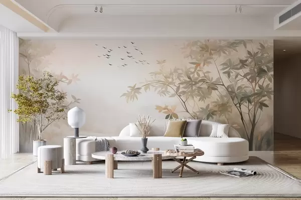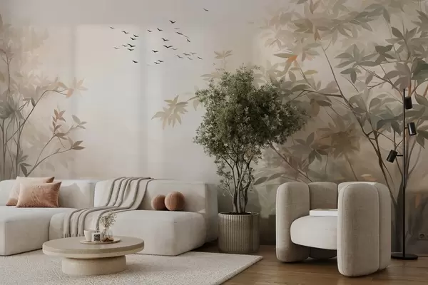 Fototapet Peisaj texturat cu copaci și o turmă de păsări zburând pe cer, culori pastelate, scenă din natură Nr. w09418