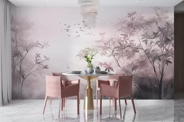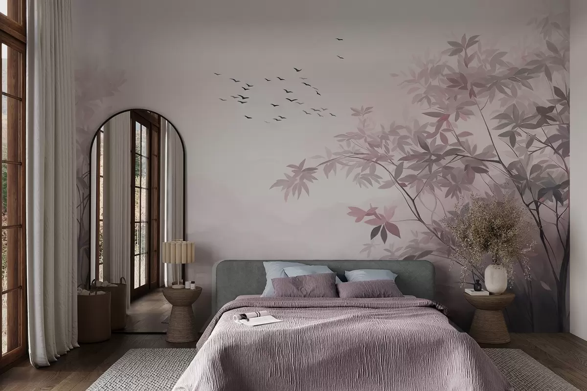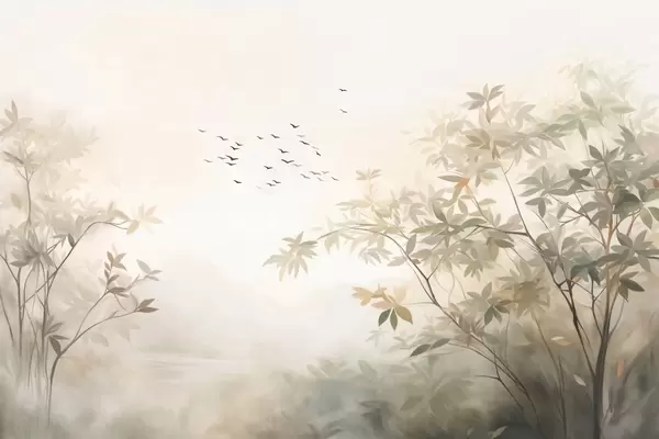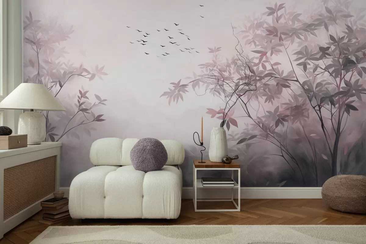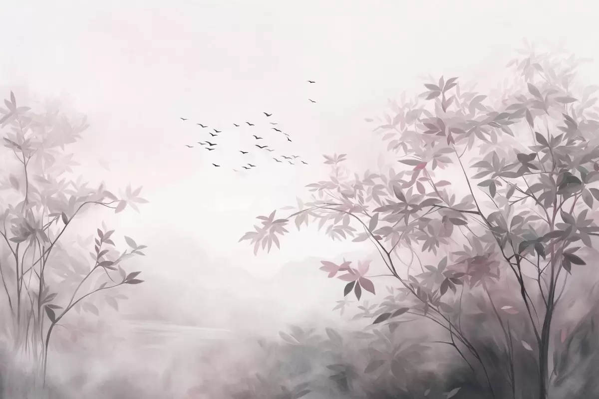 Fototapet Peisaj texturat cu copaci și o turmă de păsări zburând pe cer, culori pastelate, scenă din natură Nr. w09418v1