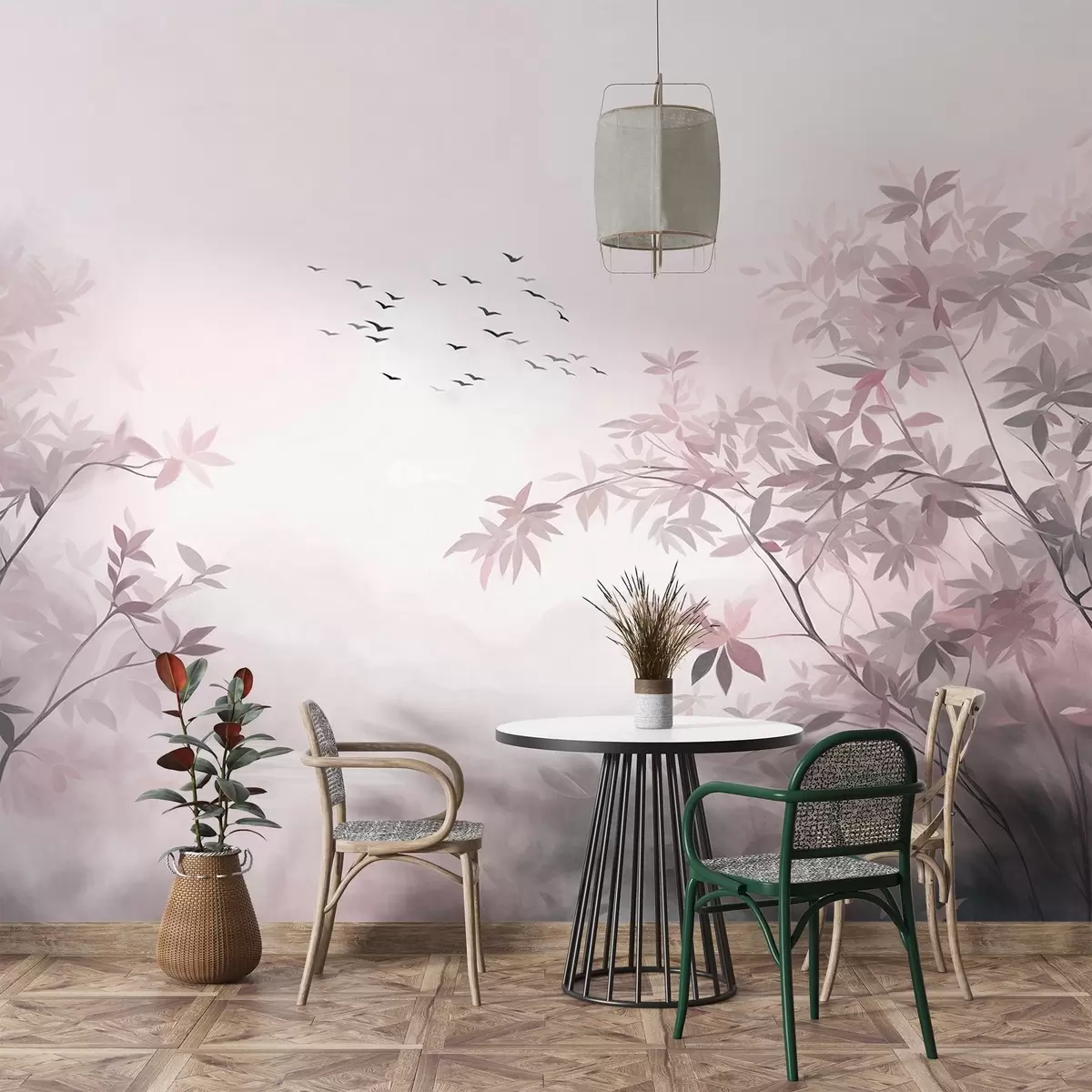 Fototapet Peisaj texturat cu copaci și o turmă de păsări zburând pe cer, culori pastelate, scenă din natură Nr. w09418v1