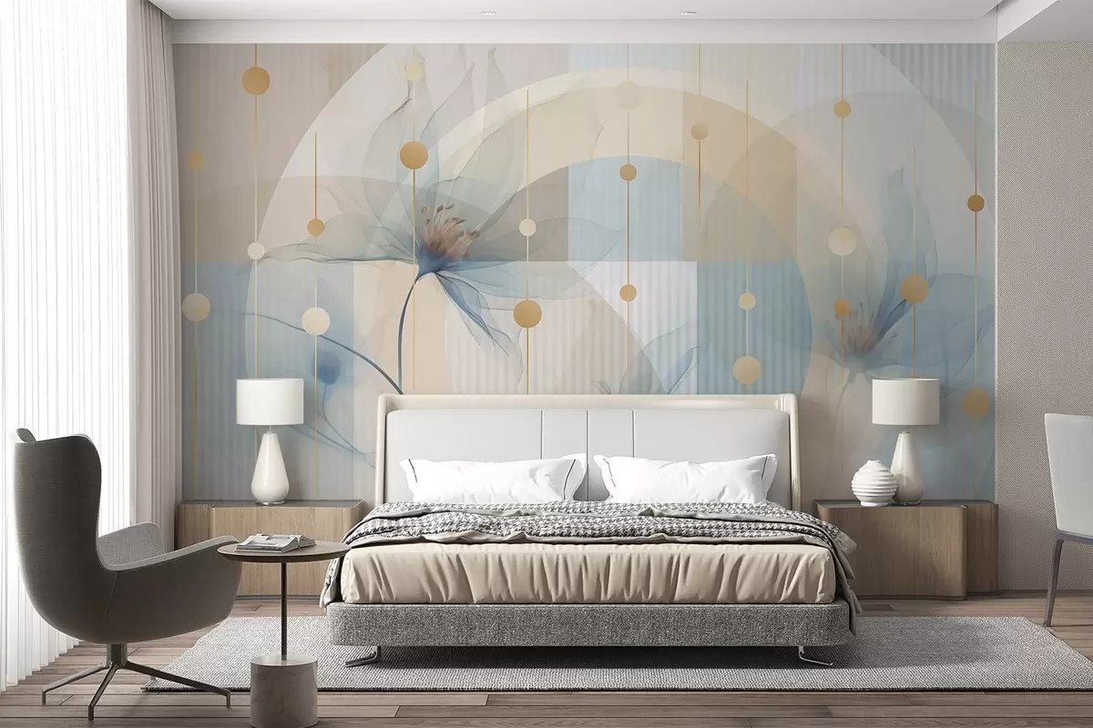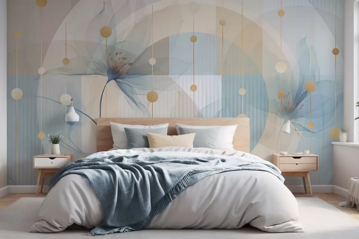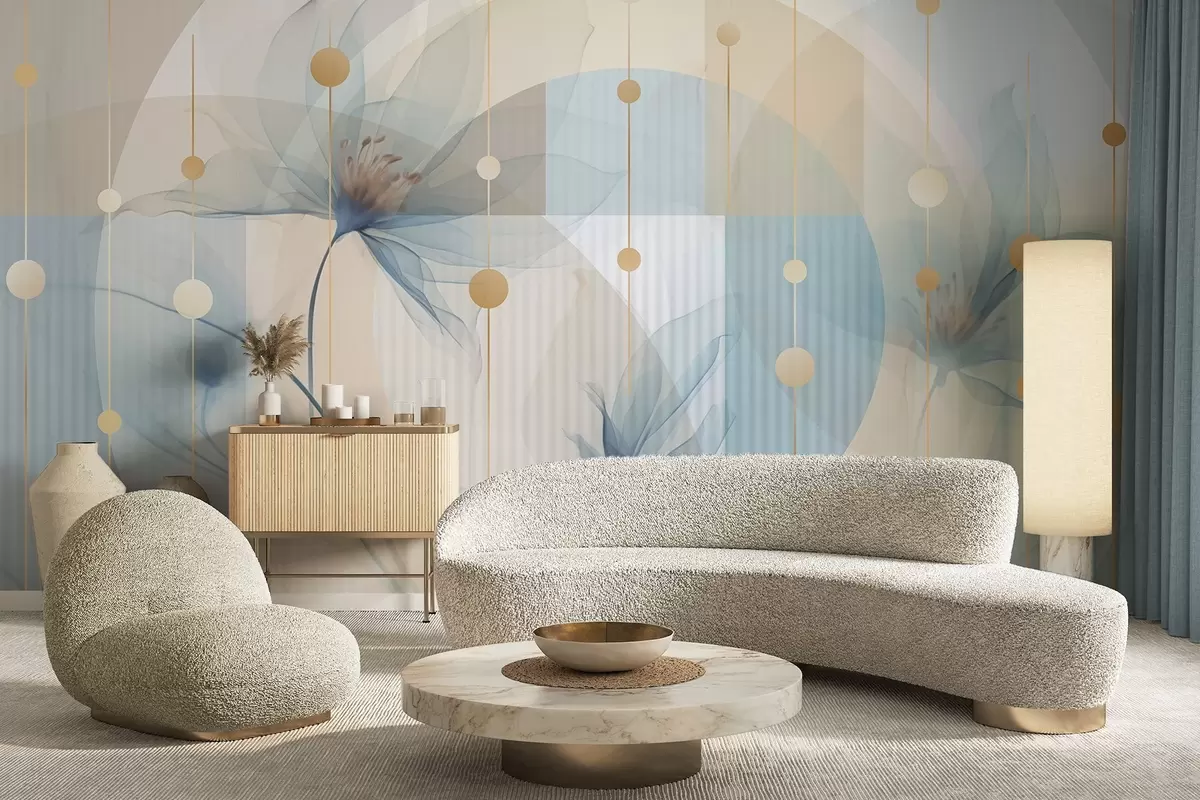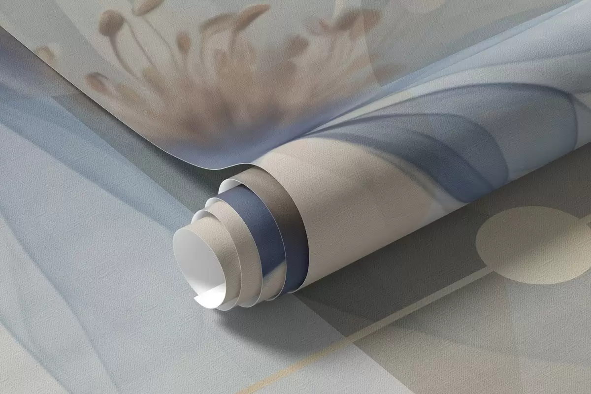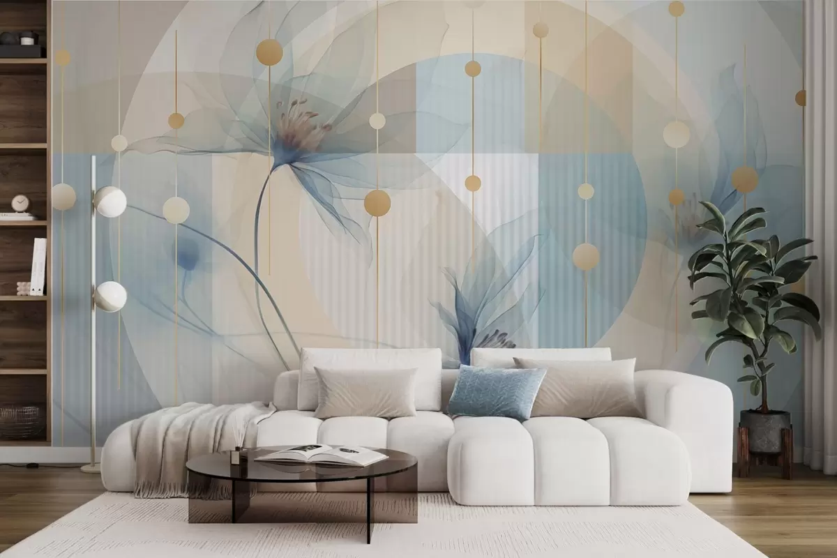 Fototapet Flori abstracte translucide, cercuri și forme geometrice, paletă de culori albastru pastel, bej și alb Nr. w09419