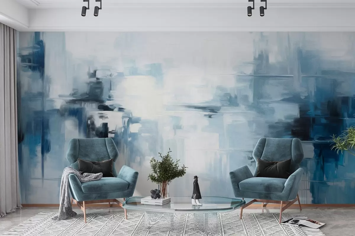 Fototapet Imitare de pictură abstractă cu textură peisagistică, cu pensule albastre și albe, stil modern Nr. w09422