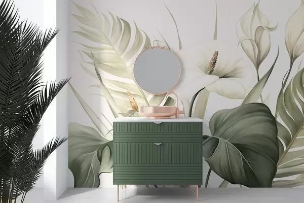 Fototapet Calla albe și frunze tropicale verzi, ilustrație botanică, fundal deschis, stil vintage, texturat Nr. w09423