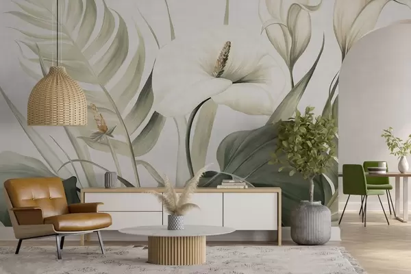 Fototapet Calla albe și frunze tropicale verzi, ilustrație botanică, fundal deschis, stil vintage, texturat Nr. w09423