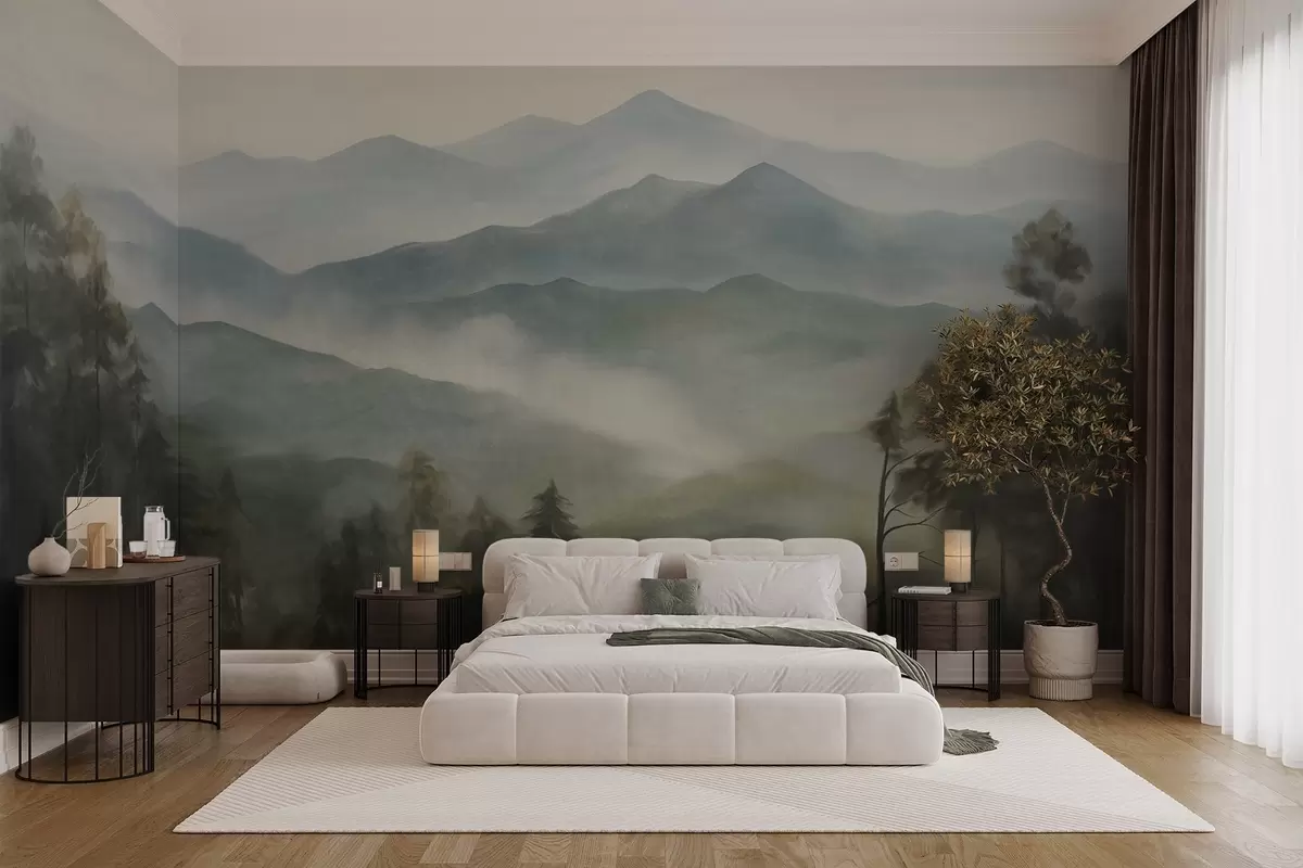 Fototapet Lanț muntos în ceață, cu copaci, ceață, cer înnorat, culori estompate, stil pictural peisagistic Nr. w09424