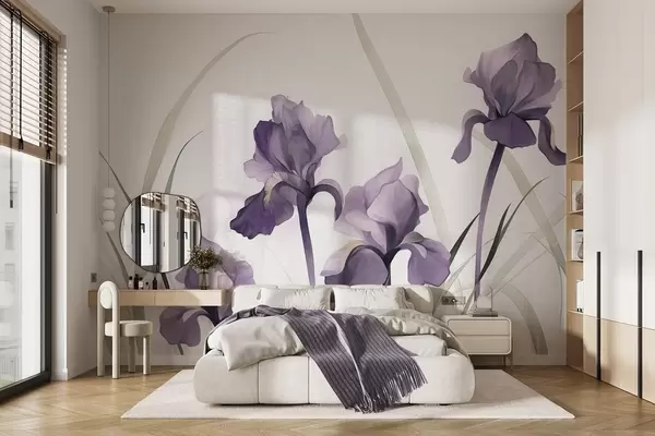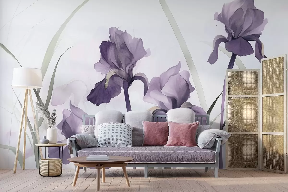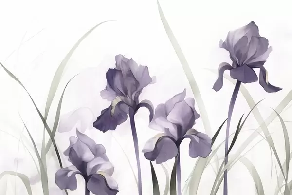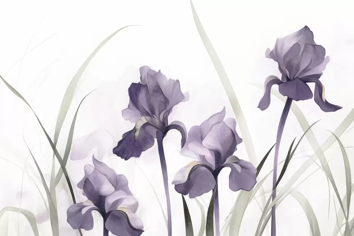 Fototapet Flori de iris violet cu tulpini verzi, stil pictură în acuarelă, fundal alb, culori delicate, elegant, artistic Nr. w09425