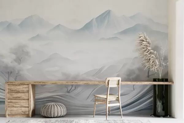 fototapet Peisaj montan abstract înzăpezit, cu copaci albi și ceață, stil minimalist texturat w09426