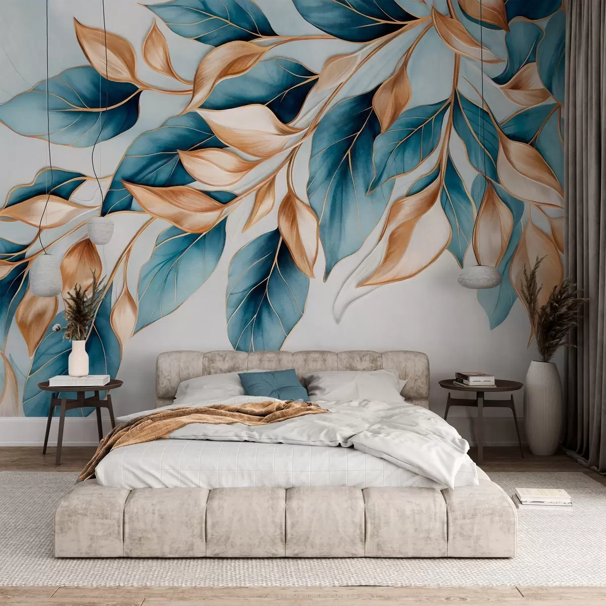 Fototapet Frunze texturate albastre și portocalii, fundal albastru deschis, design elegant și artistic, stil modern Nr. w09429