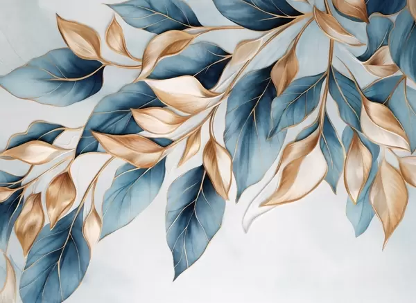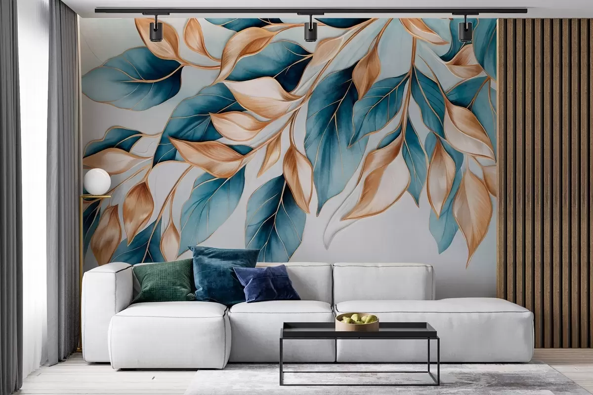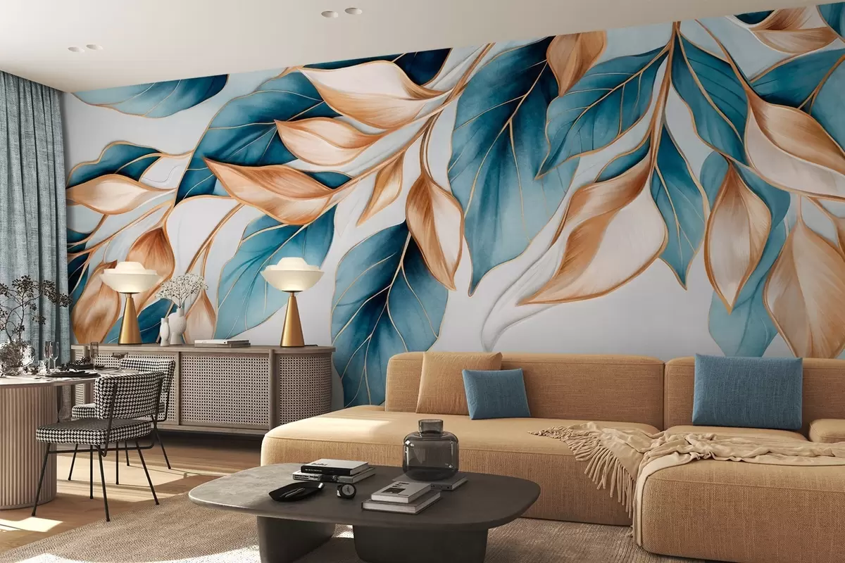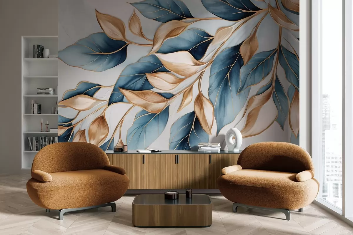 Fototapet Frunze texturate albastre și portocalii, fundal albastru deschis, design elegant și artistic, stil modern Nr. w09429