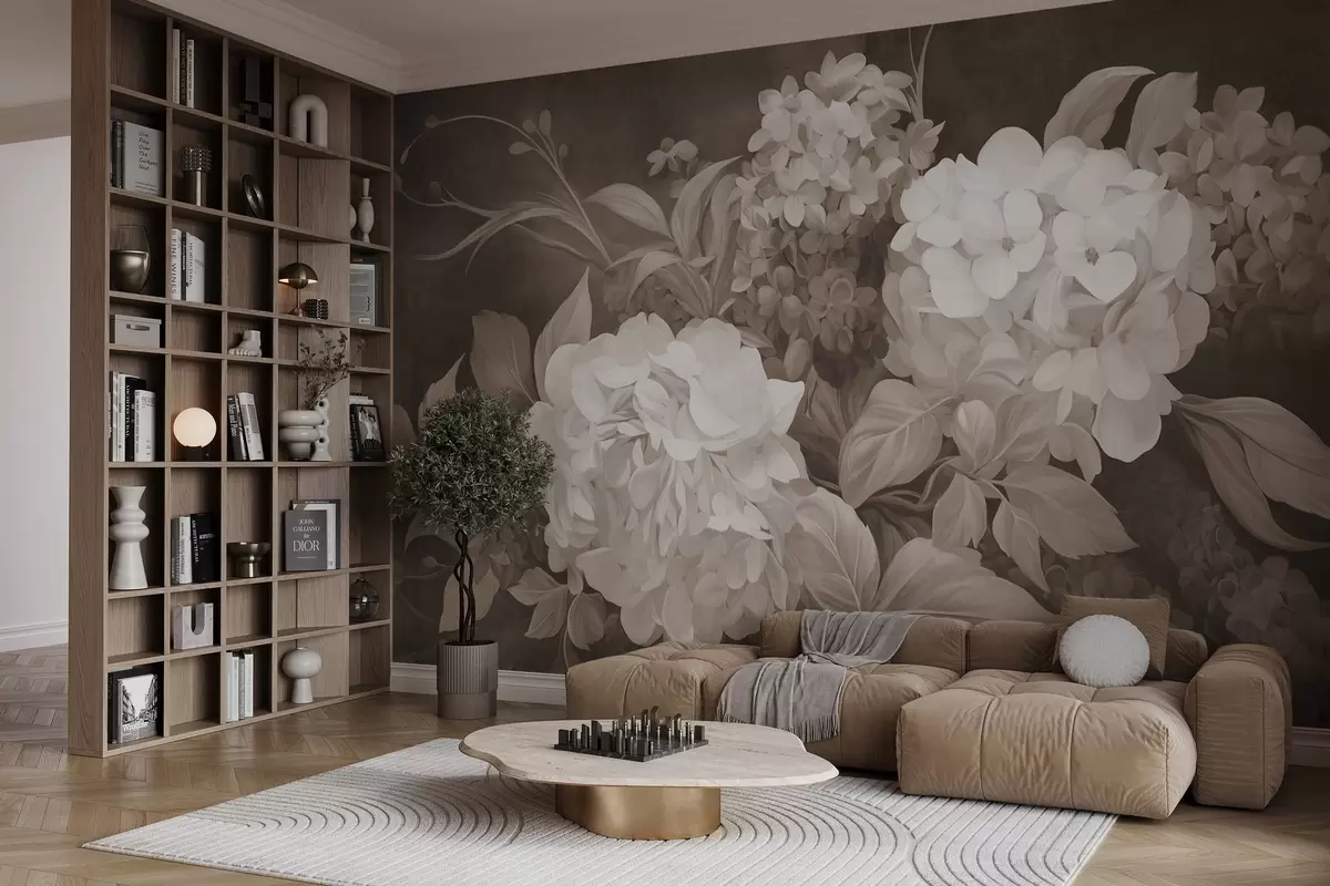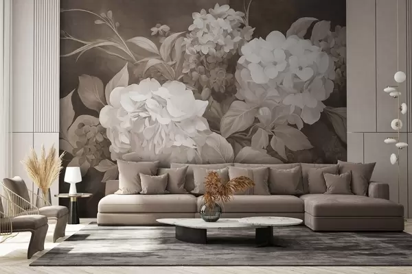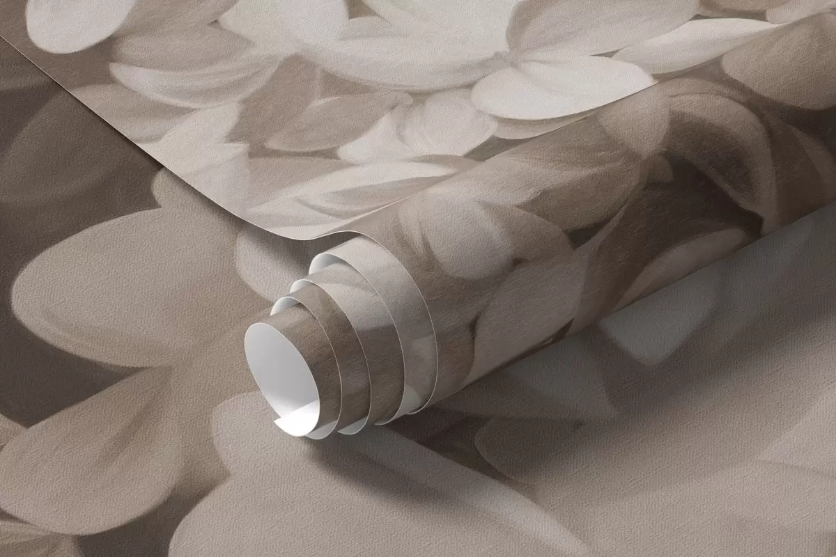 Fototapet Pictură texturată în sepia, imitație de flori de hortensie cu frunze mari, fundal abstract și întunecat Nr. w09465