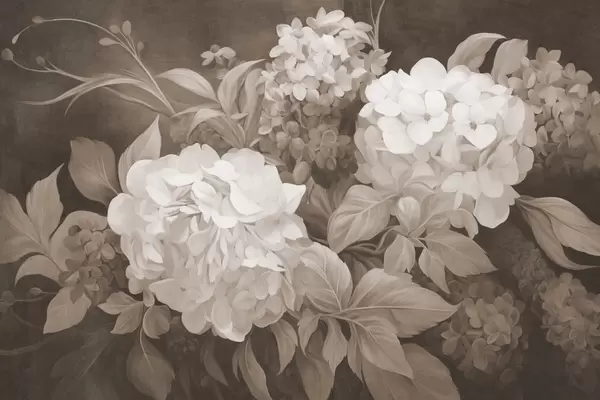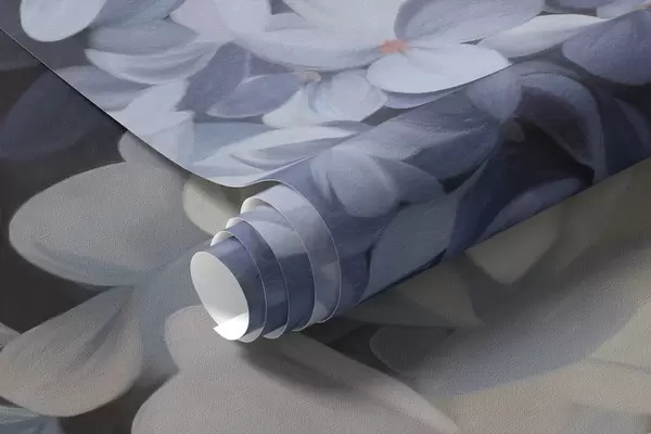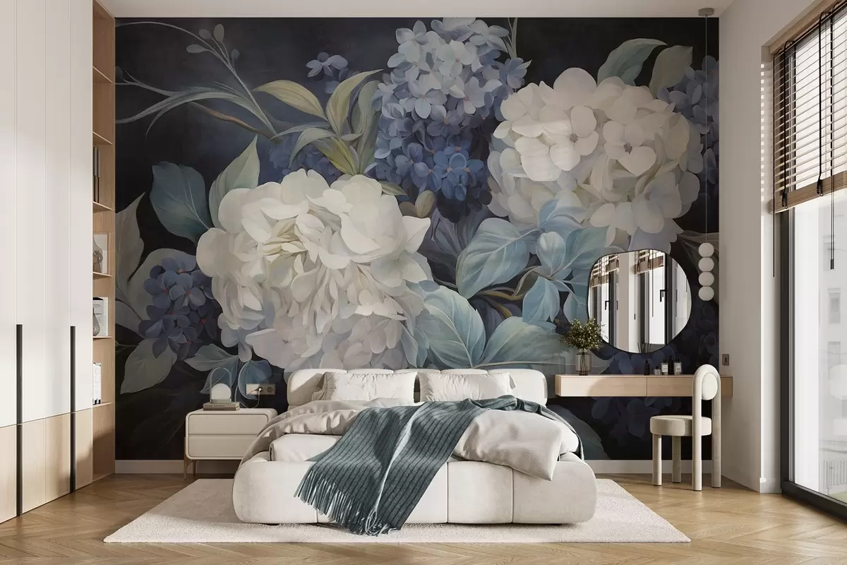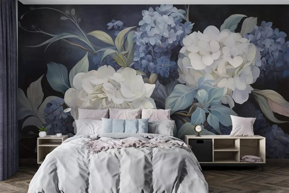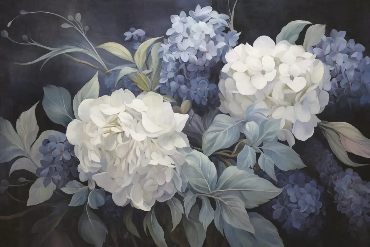 Fototapet Pictură texturată în albastru închis, imitație de flori de hortensie cu frunze mari, fundal abstract și întunecat Nr. w09465v1