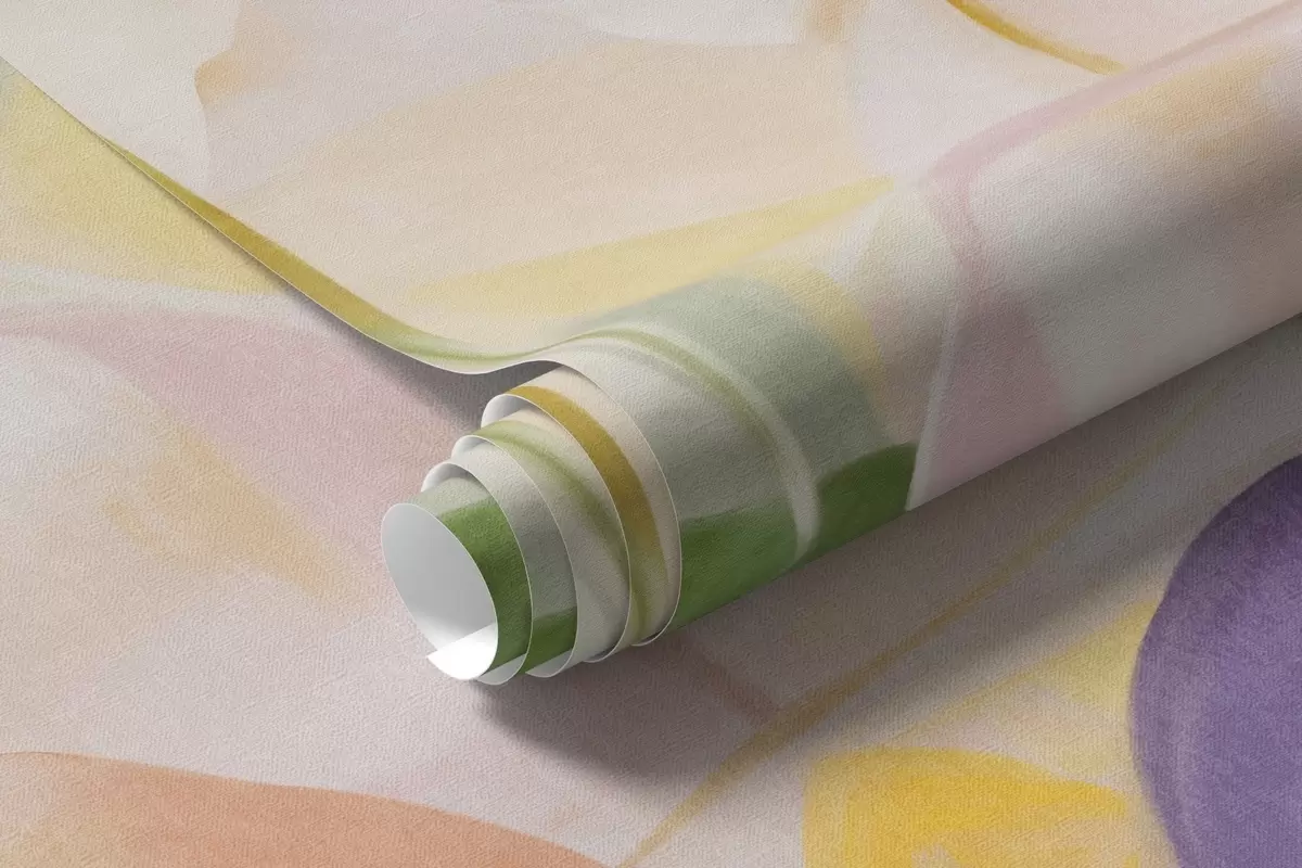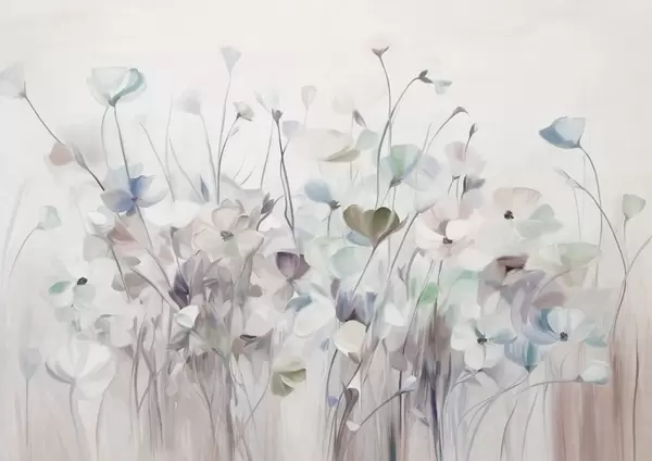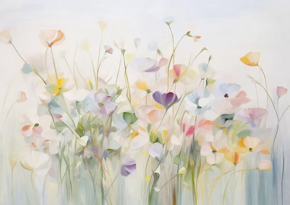 Fototapet Câmp abstract de flori colorate cu tulpini lungi și frunze verzi, texturate, în culori pastelate, deschise Nr. w09466
