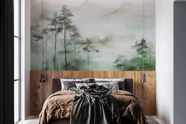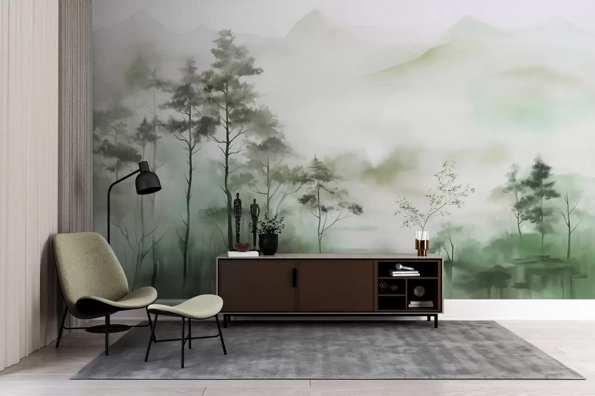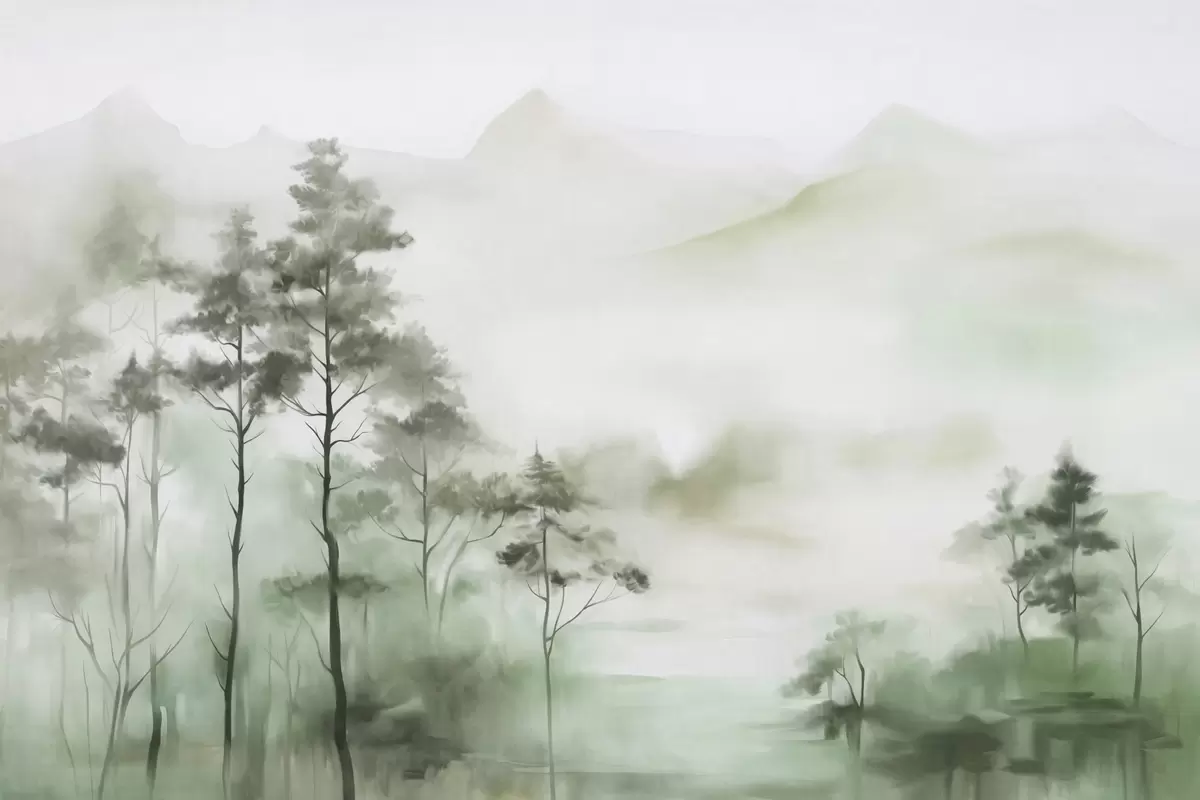 Fototapet Peisaj încețoșat cu copaci înalți și munți în tonuri discrete de verde și gri, stil minimalist, texturat Nr. w09469