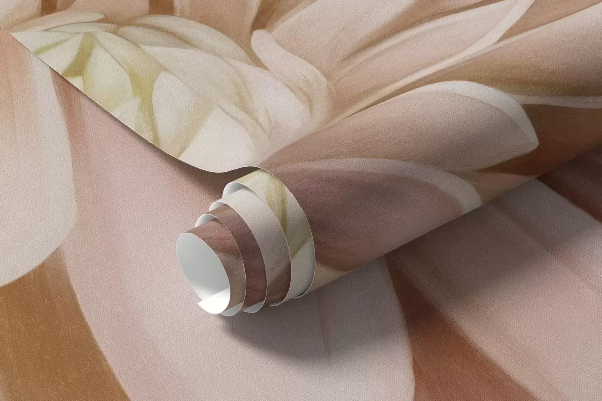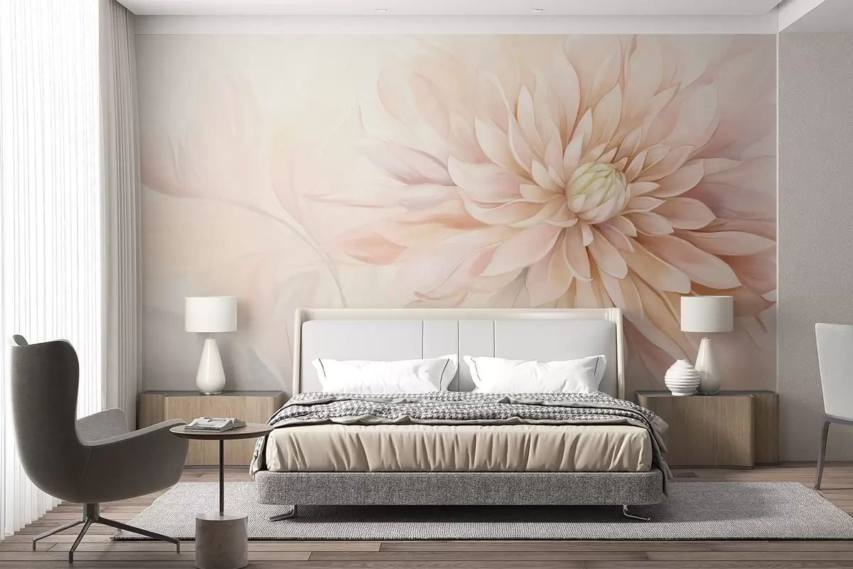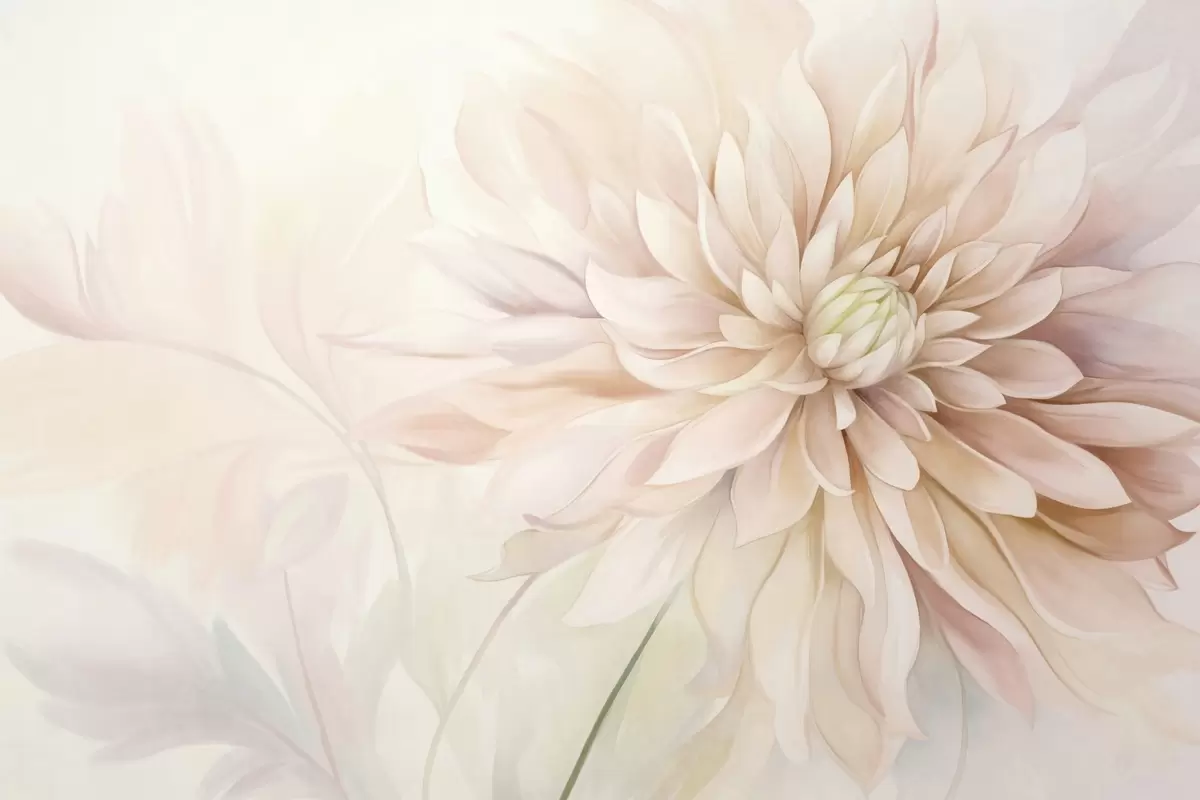 Fototapet O floare de dalie roz deschis, cu multe petale, fundal pastelat cu textură moale, cu nuanțe de verde și bej Nr. w09470