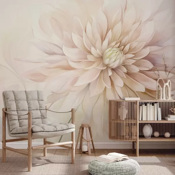Fototapet O floare de dalie roz deschis, cu multe petale, fundal pastelat cu textură moale, cu nuanțe de verde și bej Nr. w09470
