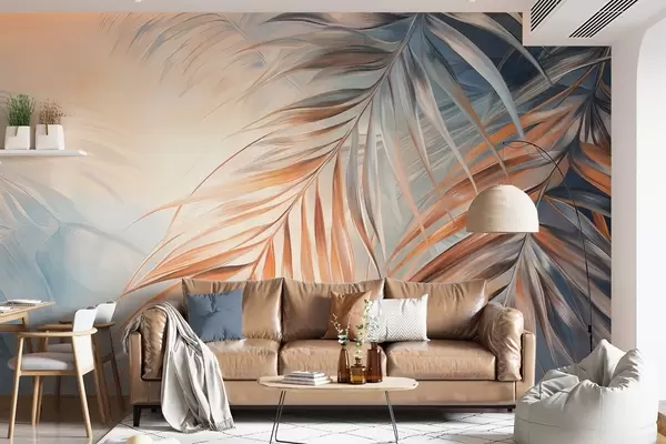 Fototapet Frunze de palmier în nuanțe de portocaliu și albastru, fundal texturat deschis cu culori delicate, stil tropical elegant Nr. w09475