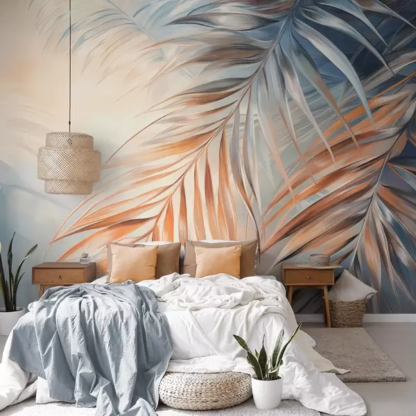 Fototapet Frunze de palmier în nuanțe de portocaliu și albastru, fundal texturat deschis cu culori delicate, stil tropical elegant Nr. w09475