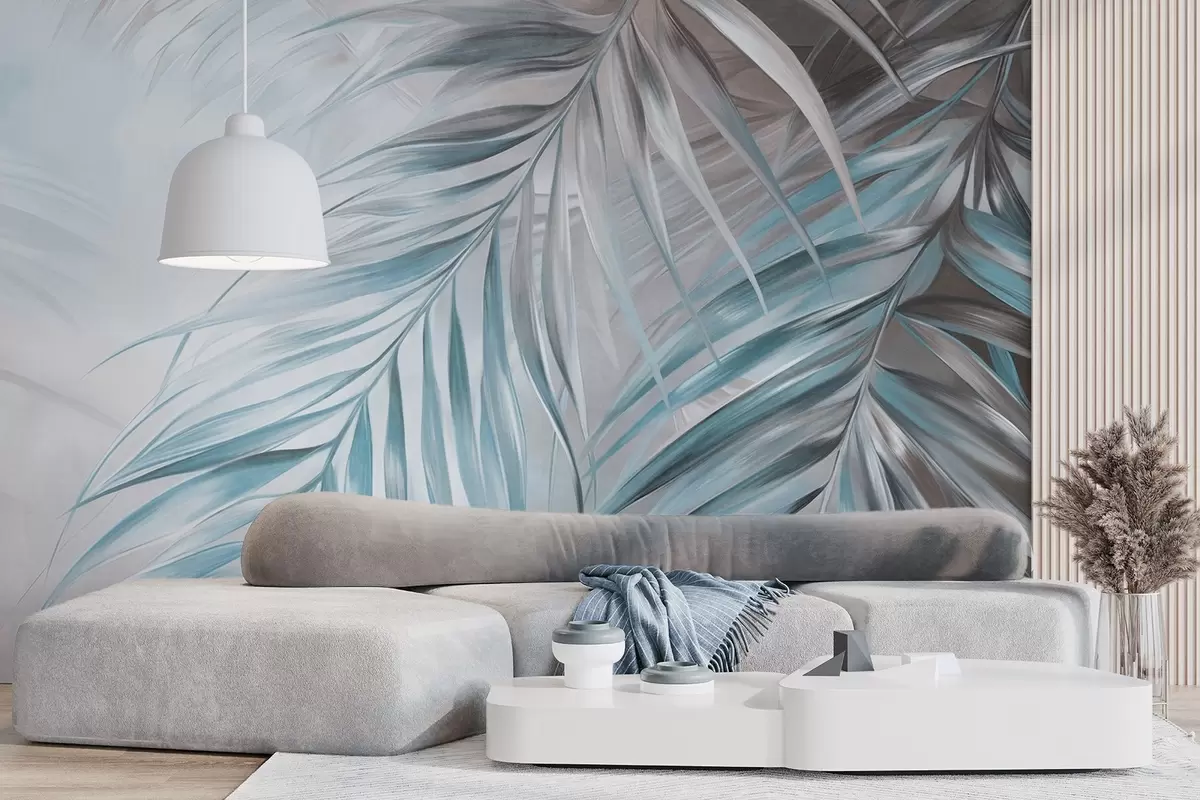 Fototapet Frunze de palmier în nuanțe de gri și albastru, fundal texturat deschis cu culori delicate, stil tropical elegant Nr. w09475v1