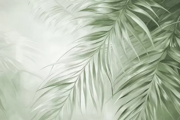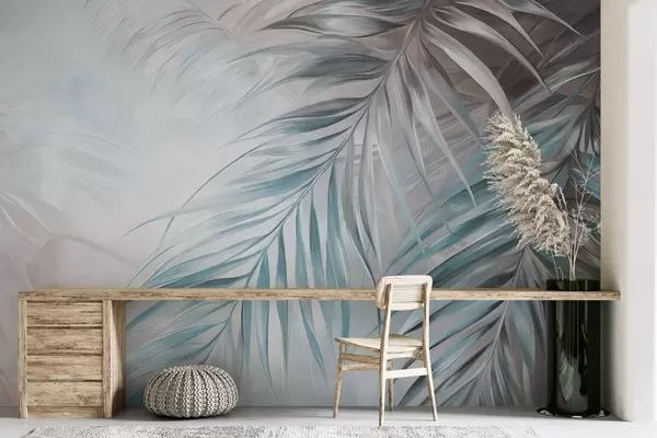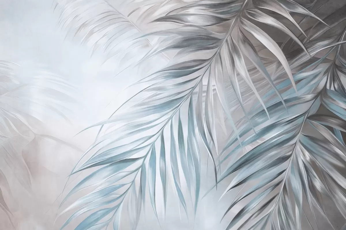 Fototapet Frunze de palmier în nuanțe de gri și albastru, fundal texturat deschis cu culori delicate, stil tropical elegant Nr. w09475v1