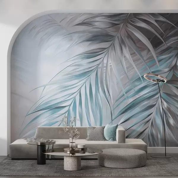 Fototapet Frunze de palmier în nuanțe de gri și albastru, fundal texturat deschis cu culori delicate, stil tropical elegant Nr. w09475v1