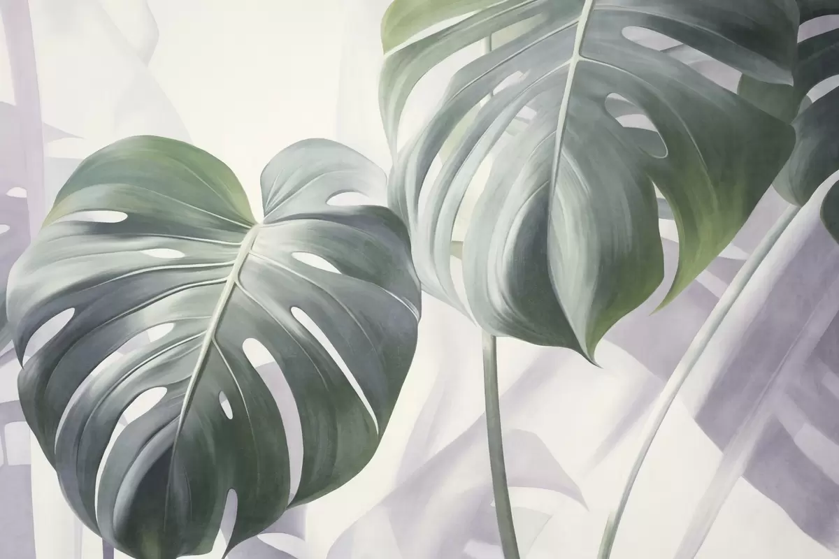 Fototapet Frunze de monstera texturate, mari și verzi, pe un fundal abstract, moale și deschis la culoare Nr. w09477