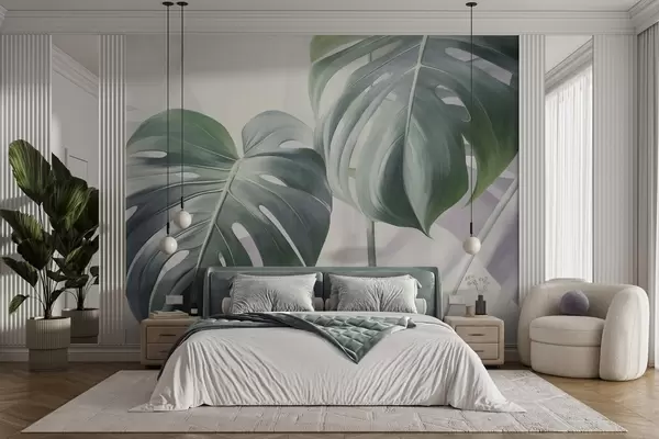 Fototapet Frunze de monstera texturate, mari și verzi, pe un fundal abstract, moale și deschis la culoare Nr. w09477