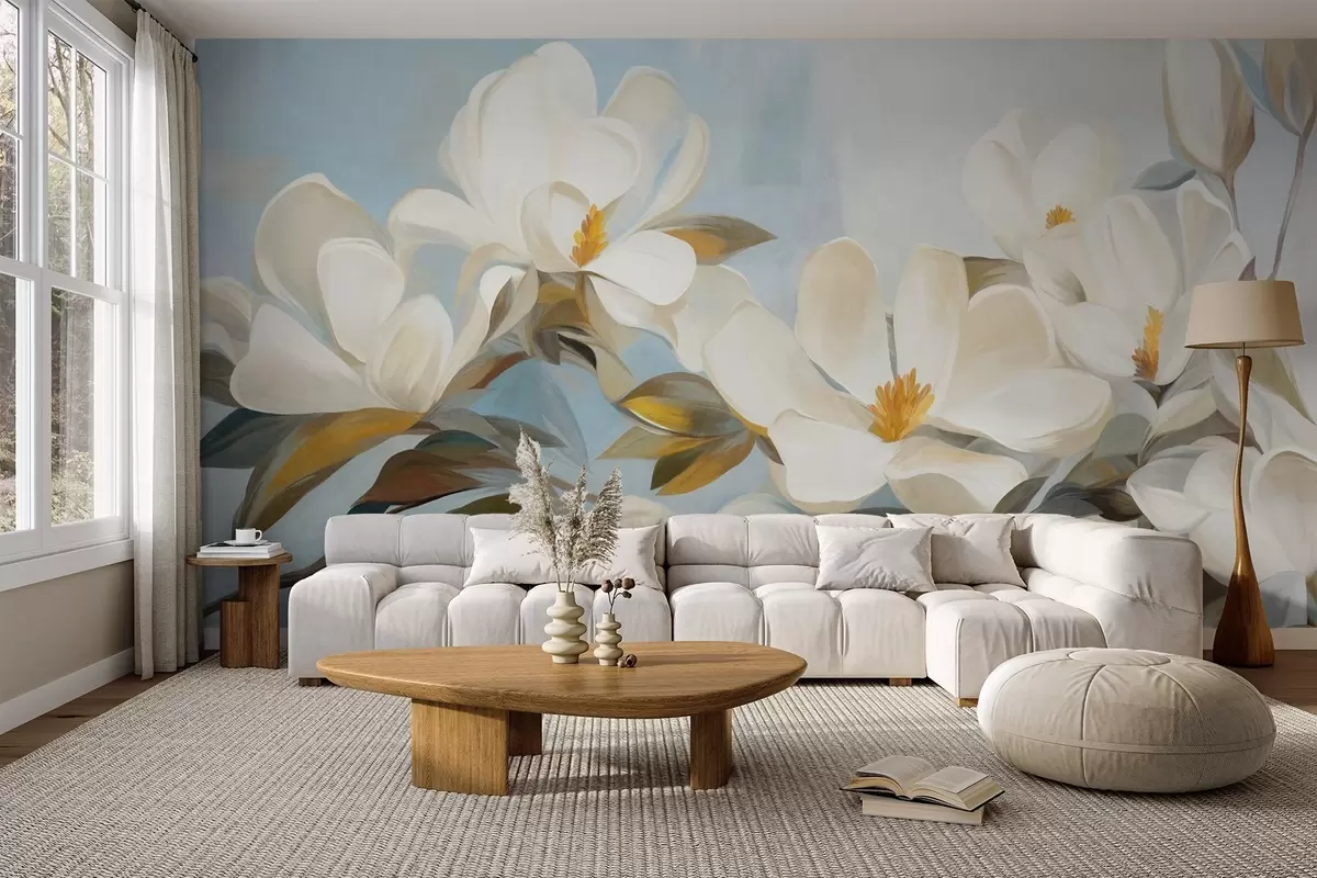 Fototapet Magnolii albe cu frunze verzi pe un fundal albastru deschis cu imitație de pensule abstracte Nr. w09478