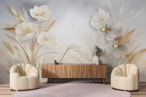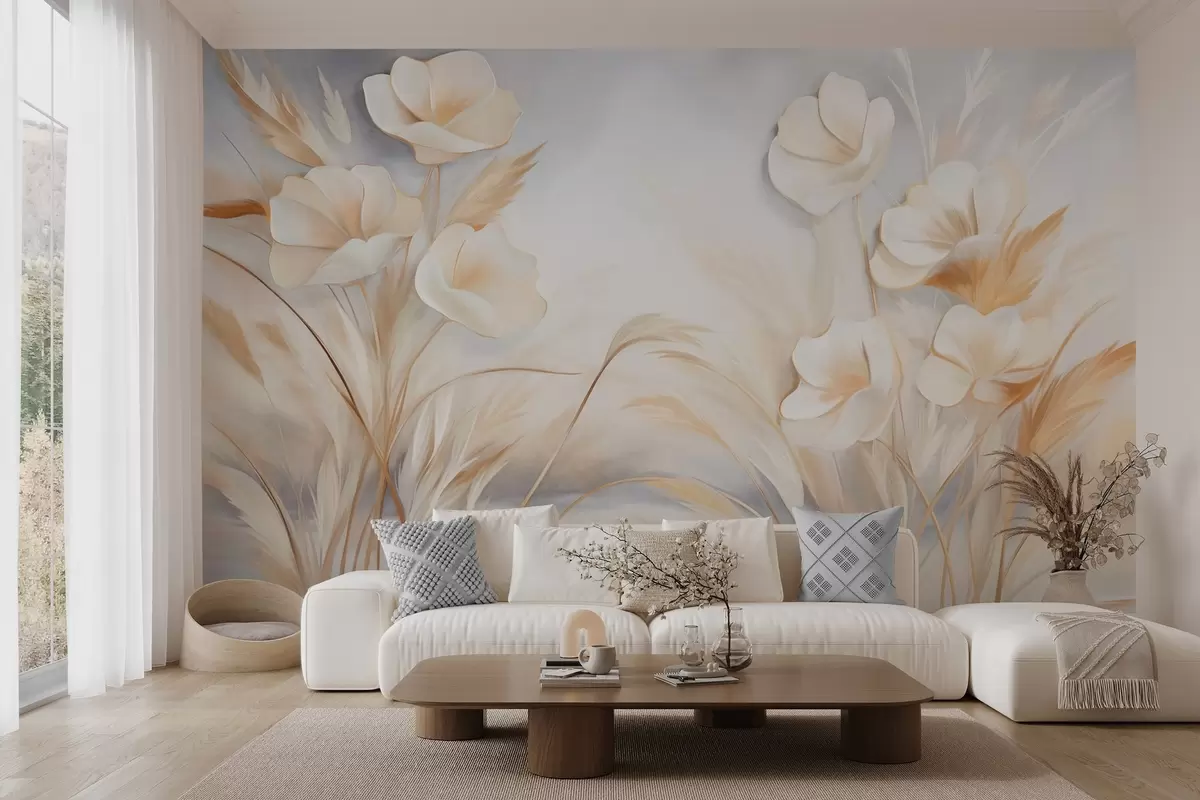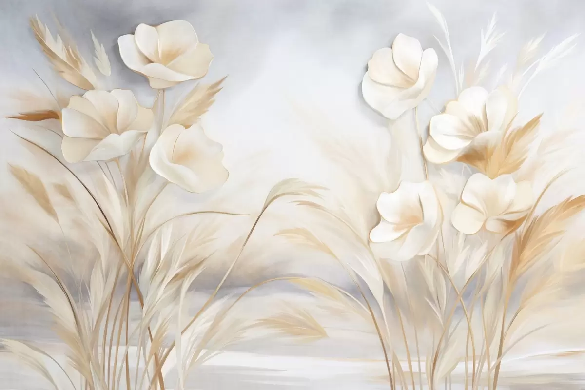 Fototapet Flori albe, stuf bej și iarbă pampas, texturat, elegant, stil minimalist, fundal abstract peisaj Nr. w09490