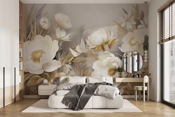 Fototapet Bujori albi și galbeni și alte flori cu iarbă înaltă și frunze într-un stil texturat, moale, pictural Nr. w09494