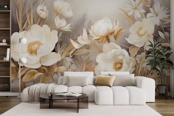 Fototapet Bujori albi și galbeni și alte flori cu iarbă înaltă și frunze într-un stil texturat, moale, pictural Nr. w09494