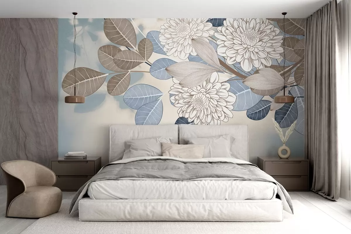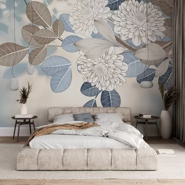 Fototapet Flori albe cu frunze albastre și maro, fundal texturat albastru deschis, aranjament floral, desen detaliat Nr. w09496