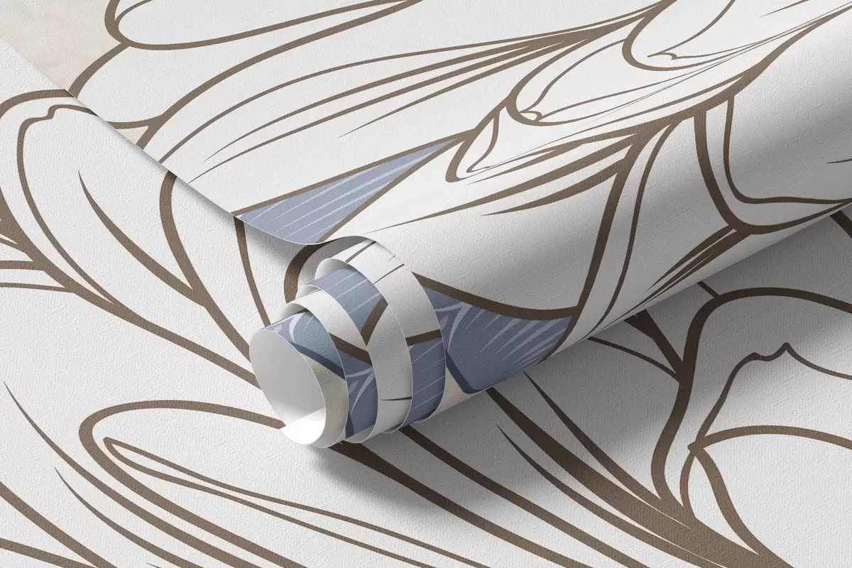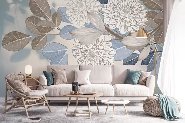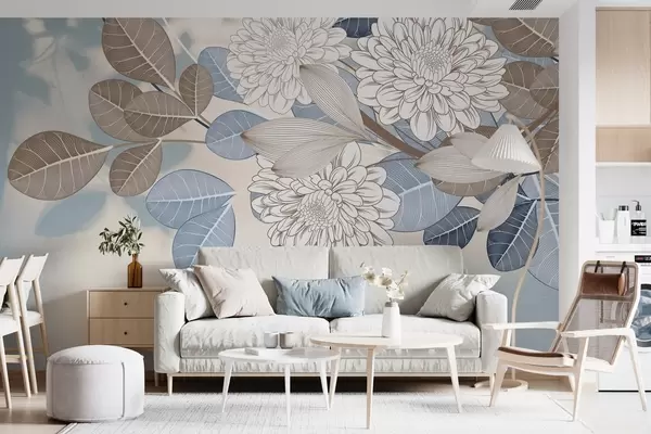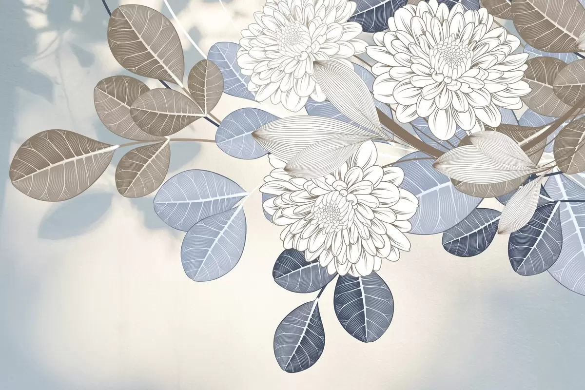 Fototapet Flori albe cu frunze albastre și maro, fundal texturat albastru deschis, aranjament floral, desen detaliat Nr. w09496