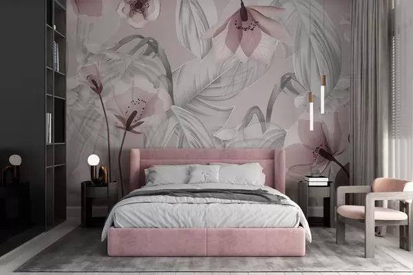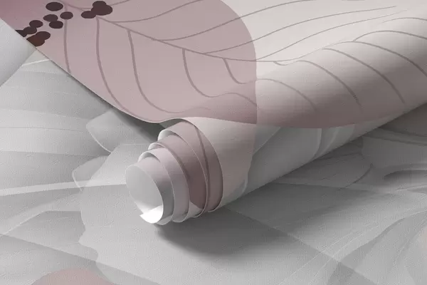 Fototapet Flori roz și frunze gri, fundal botanic floral, design elegant, culori delicate, detalii fine și delicate Nr. w09497