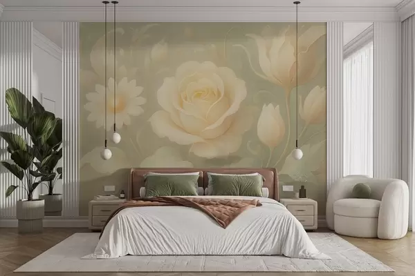 Fototapet Compoziție vintage delicată cu trandafiri bej pe un fundal verde deschis Nr. w09499