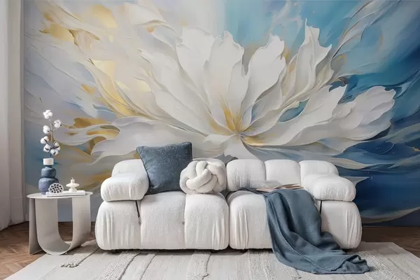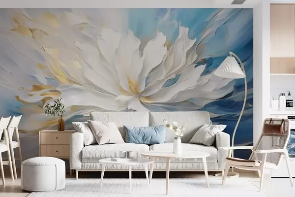 Fototapet Bujor alb mare în stil pictură în ulei pe fundal albastru-galben Nr. w09511