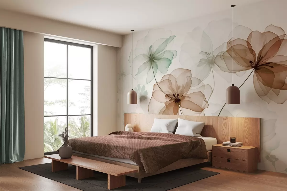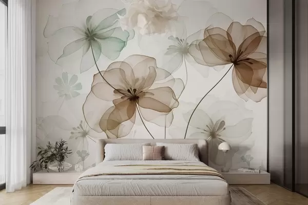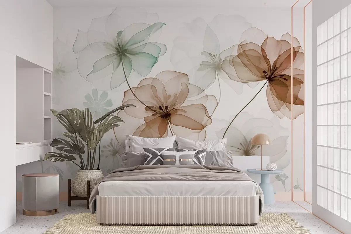 Fototapet Flori translucide cu petale maro și verzi, tulpini lungi, fundal deschis, culori delicate, design floral texturat Nr. w09529