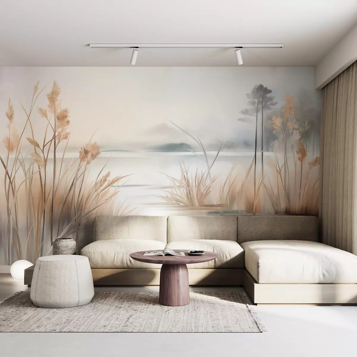 Fototapet Peisaj cu un lac și iarbă înaltă în prim-plan, munți în fundal, culori delicate, texturat Nr. w09534