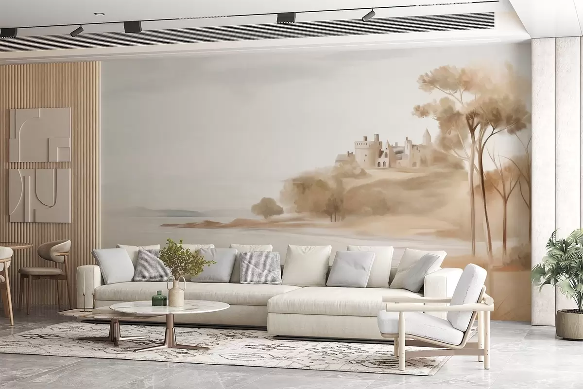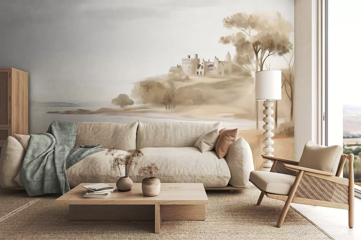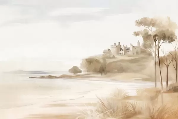 Fototapet Peisaj cu un castel pe un deal lângă mare, o plajă cu nisip în prim-plan, culori discrete, artă texturată Nr. w09540