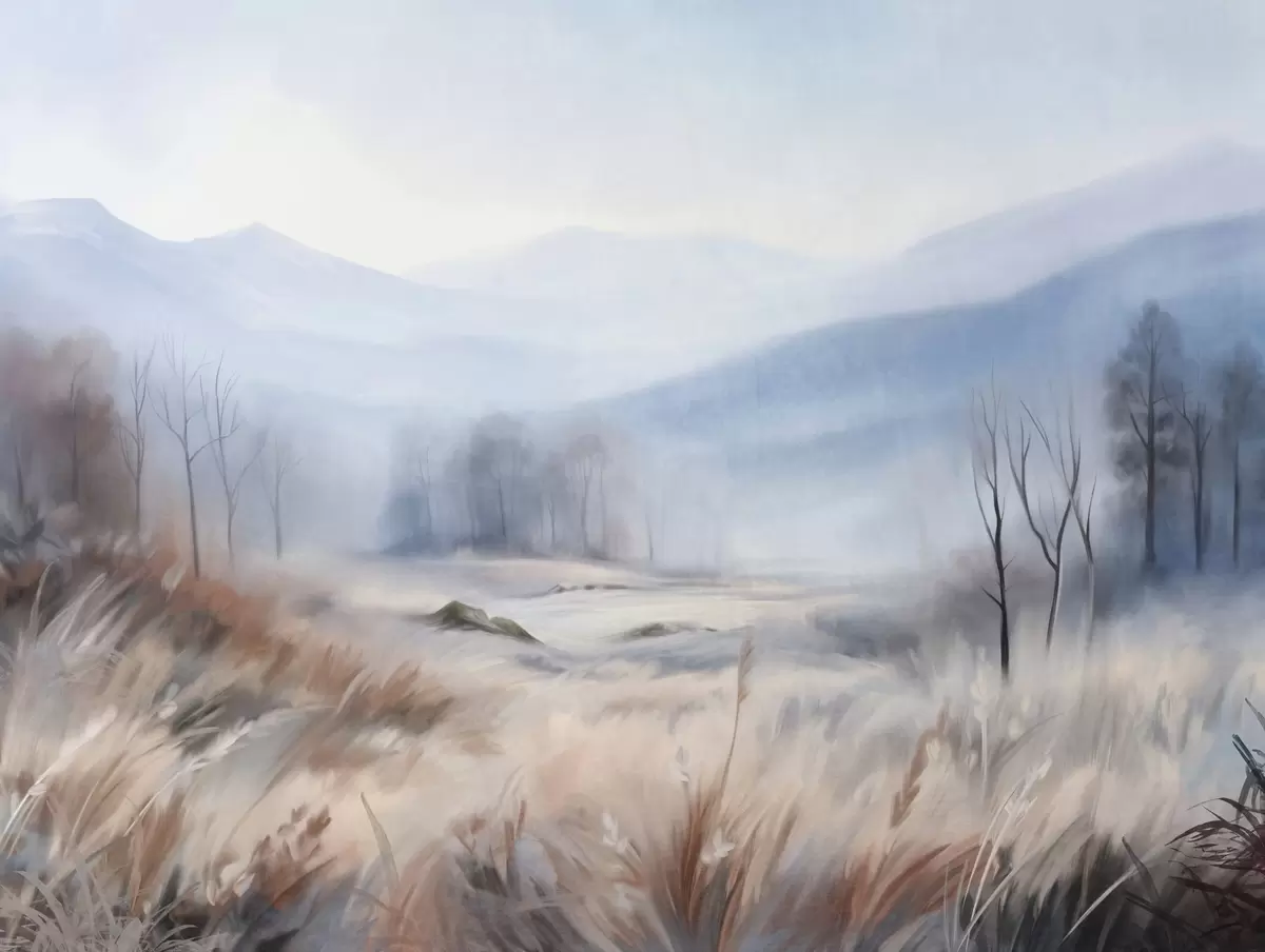 Fototapet Peisaj texturat cu iarbă uscată în prim-plan și copaci în fundal, cu munți în depărtare Nr. w09542