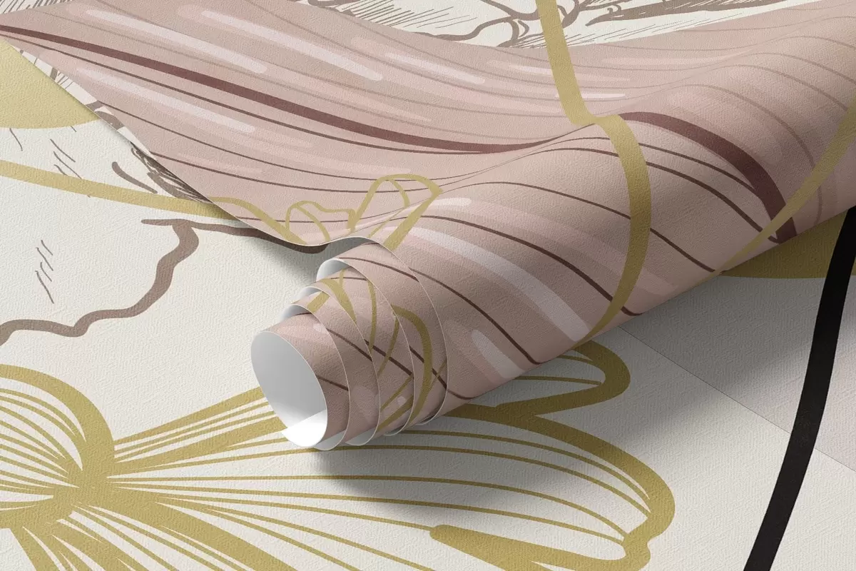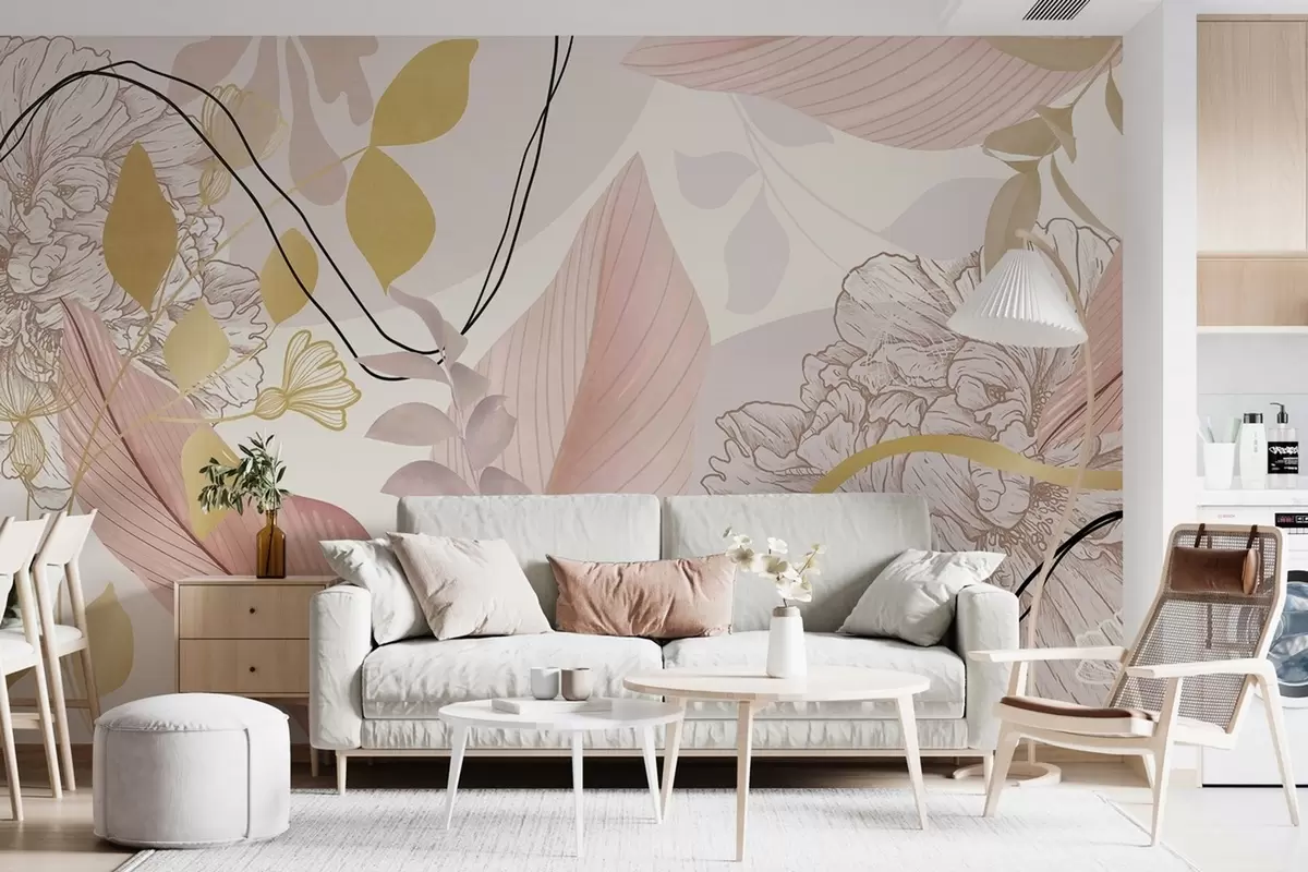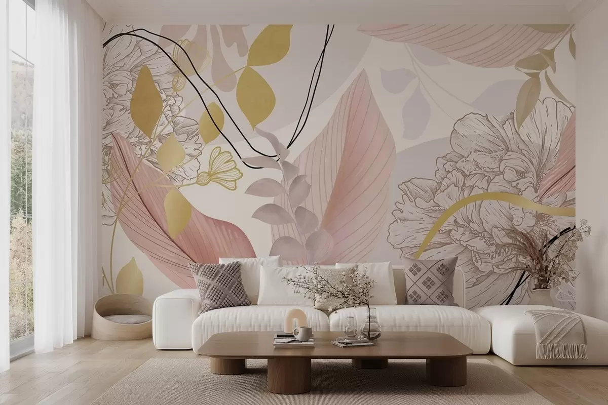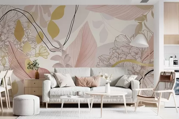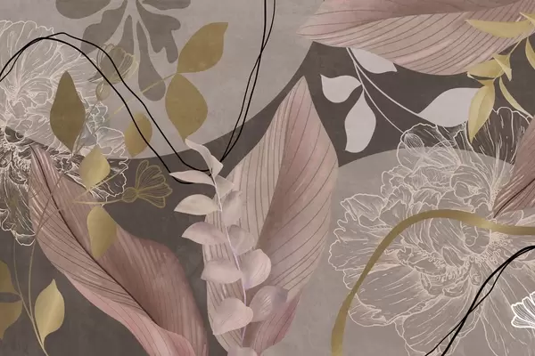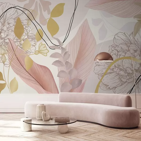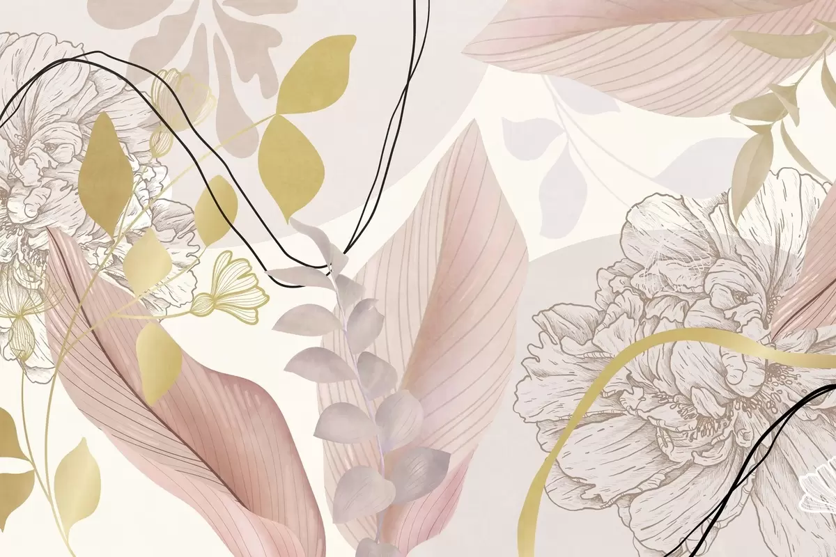 Fototapet Imprimeu floral abstract cu frunze mari în nuanțe de roz pal, galben cu linii subțiri negre și contururi florale albe Nr. w09544v1