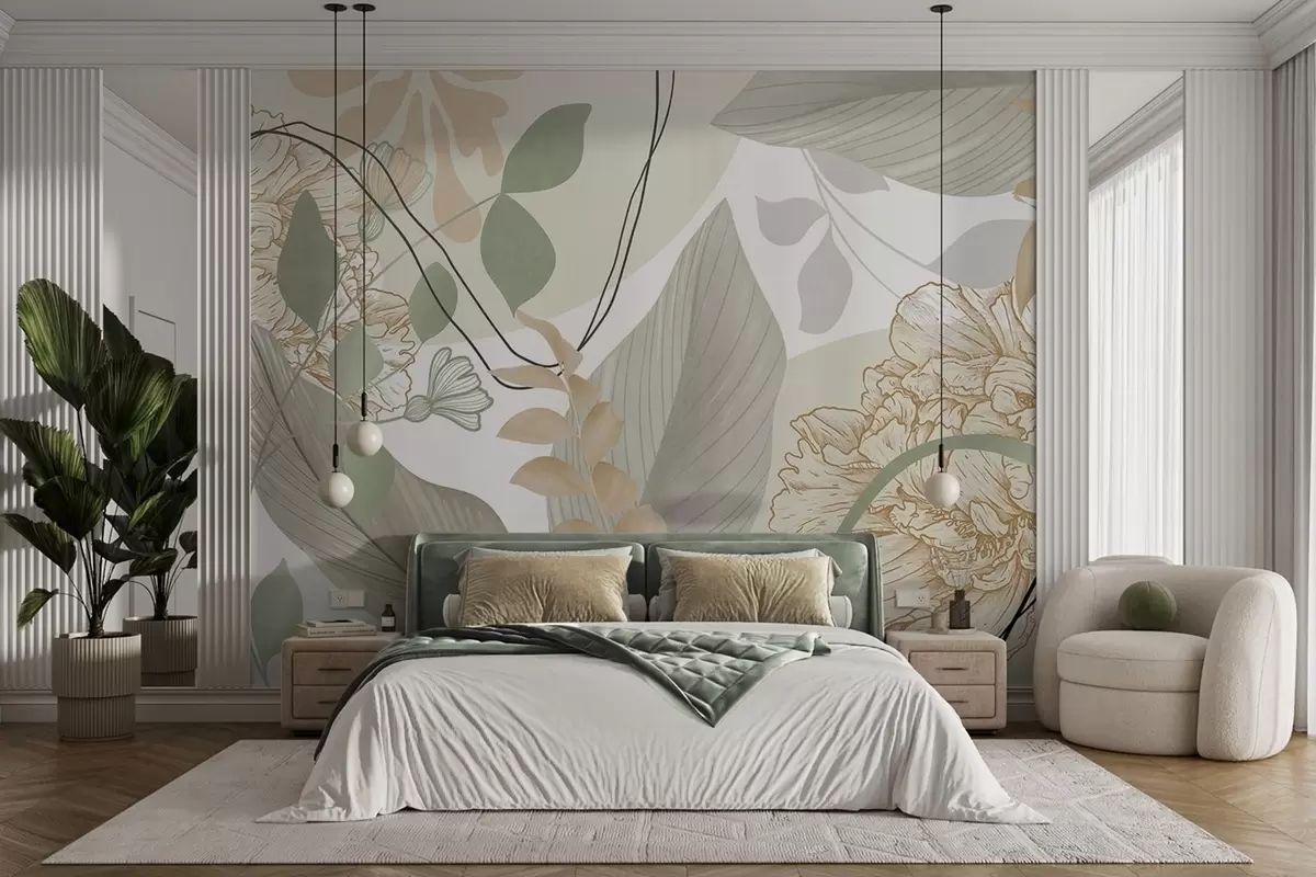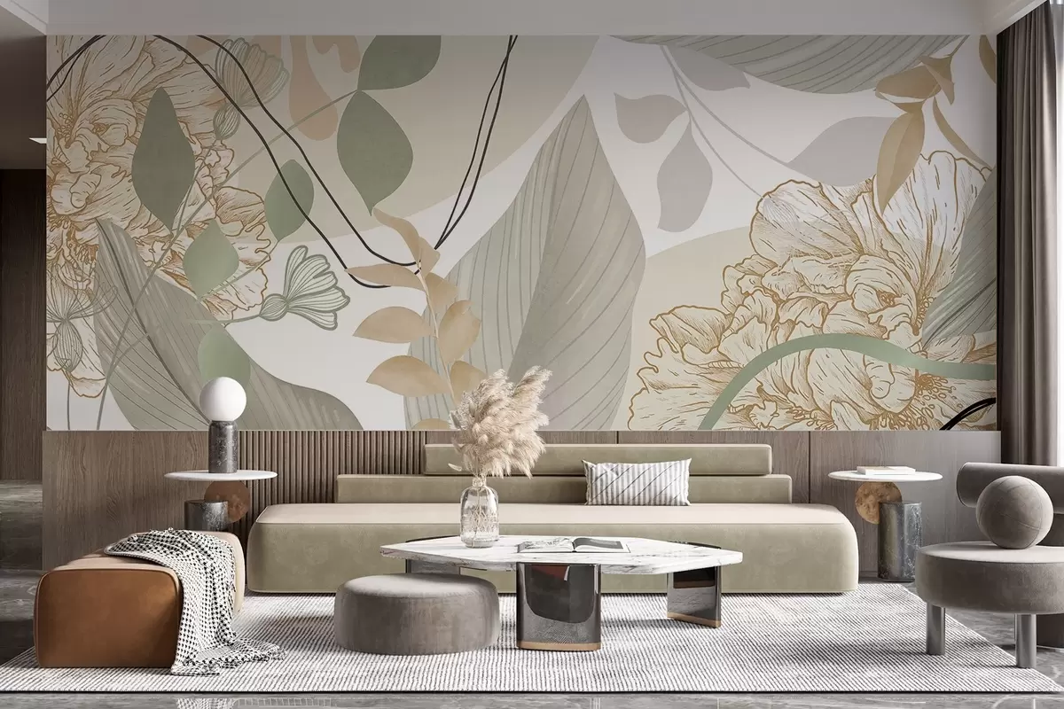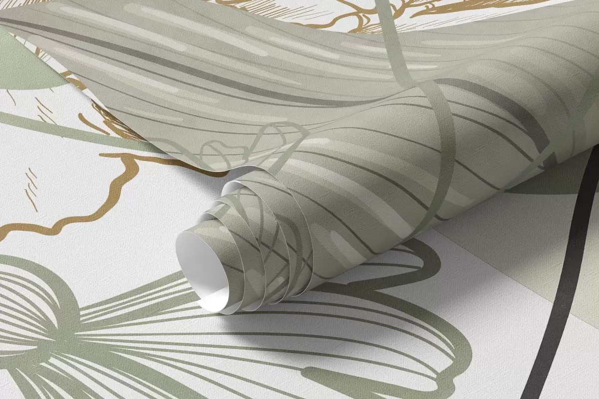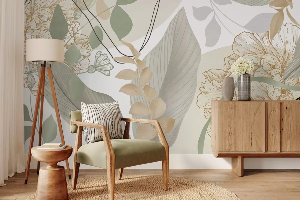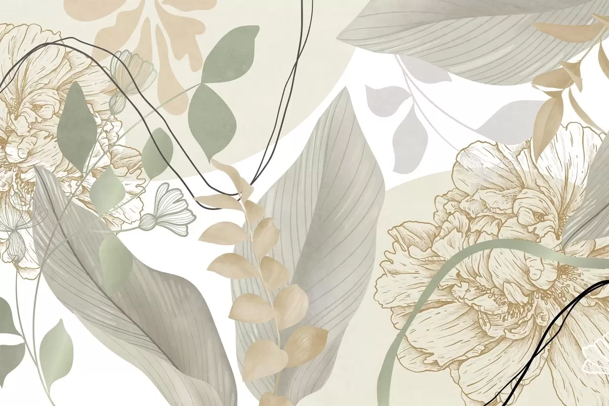 Fototapet Imprimeu floral abstract cu frunze mari în nuanțe de verde și galben estompat, cu linii subțiri negre și contururi florale albe. Nr. w09544v2