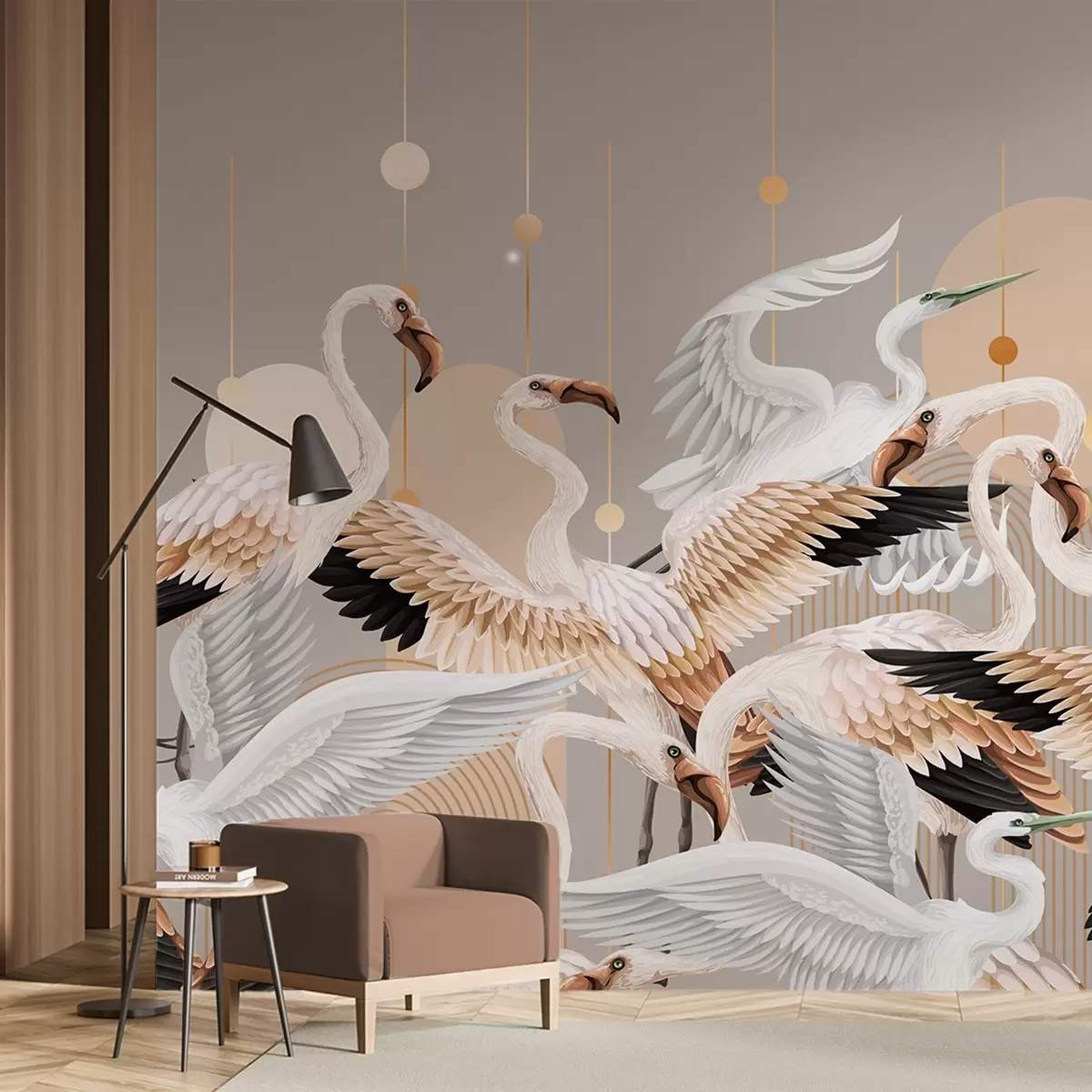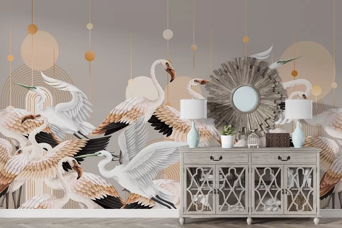 Fototapet Un stol de flamingo albi cu aripi delicate, pe un fundal neutru cu linii și cercuri galbene Nr. w09546v1