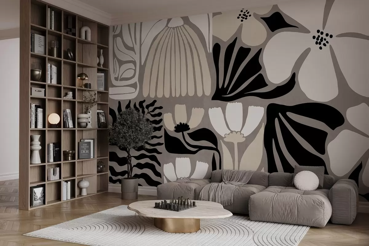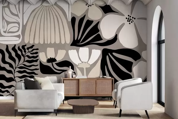 Fototapet Flori și frunze stilizate în stil minimalist modern, în culori bej, negru și alb, texturate pe un fundal gri Nr. w09547