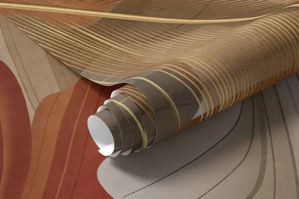 Fototapet Forme abstracte texturate, mari și fluide, în culori crem și ruginiu, cu pene delicate, galbene, bej și maro Nr. w09549