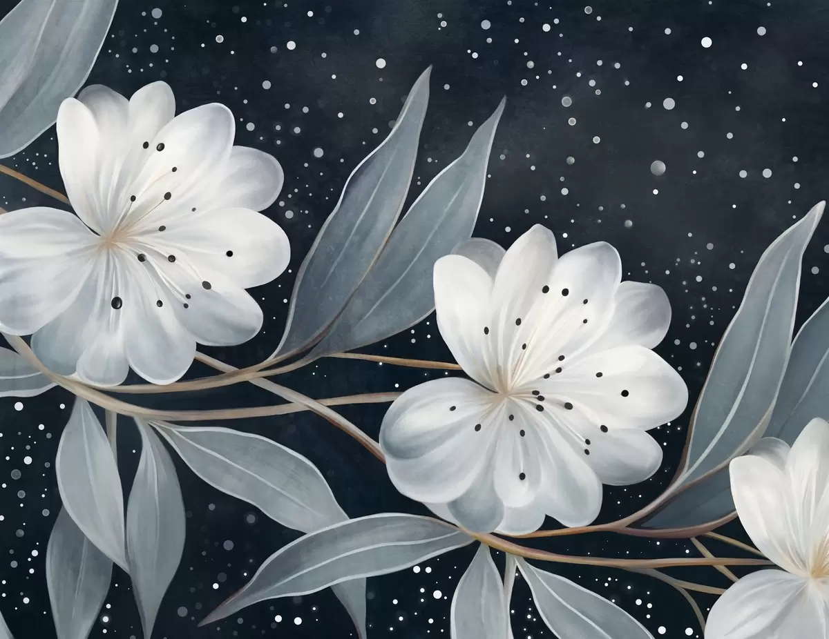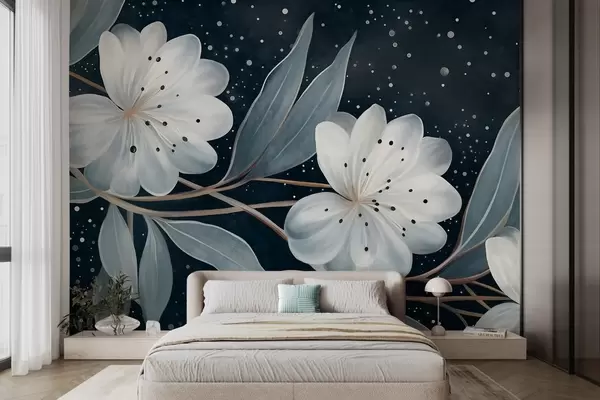 Fototapet Flori albe cu textură fantastică, înconjurate de frunze și ramuri albastru-verzui pe un fundal întunecat Nr. w09551