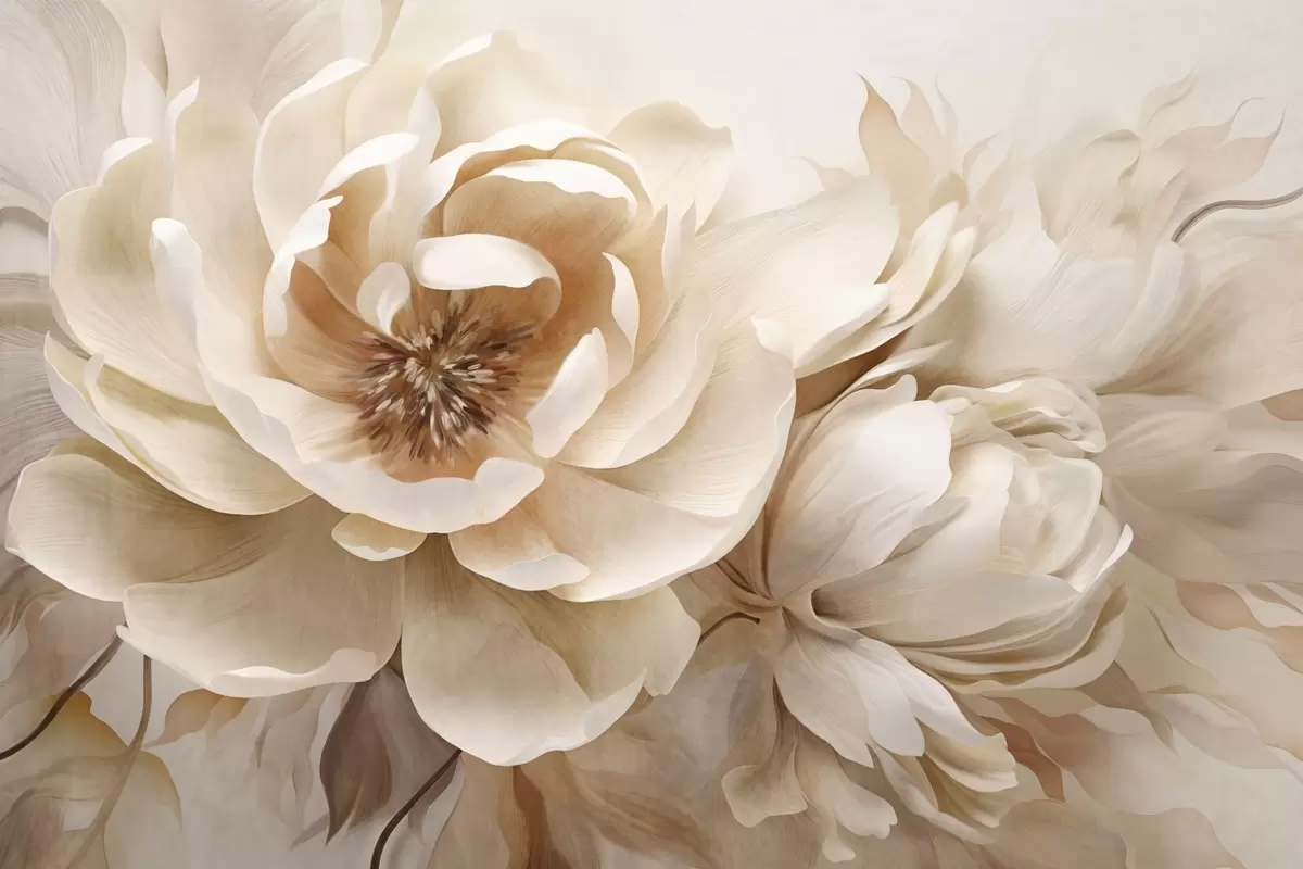 Fototapet Bujori cu textură cremoasă, cu mijlocul maro și frunze pe un fundal abstract estompat și luminos Nr. w09554